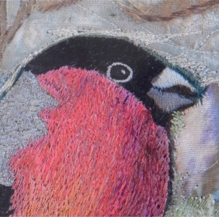 Such a lovely subject for illustration with its beautiful rose-blush chest, big beak and plump shape, I wanted to immortalise the Bullfinch in stitch and show the grading of pale-ish pink through orange to almost burgundy. For the collage background I used fragments of old patterned cotton in a limited palette to complement the subject matter and stitched into it for shading detail.