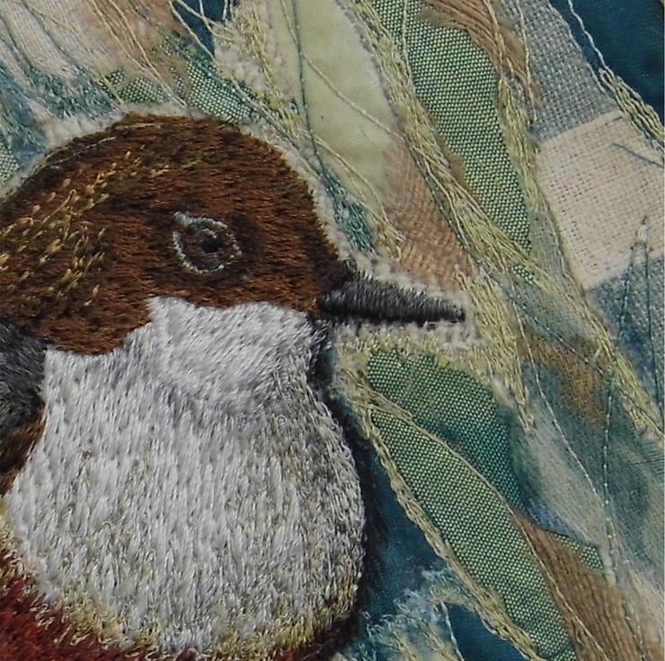 We have a river near us in Devon where I am lucky enough to spot Dippers now and again bobbing up and down on rocks and diving into the water. They stand out when you see their white throats. In the original collage background I wanted an impression of fast flowing water so cut fluid shapes from two shades of silk and some cotton, plus a tiny bit of lace and gauze to express the frothy churning water, which I then stitched over.