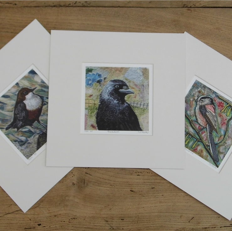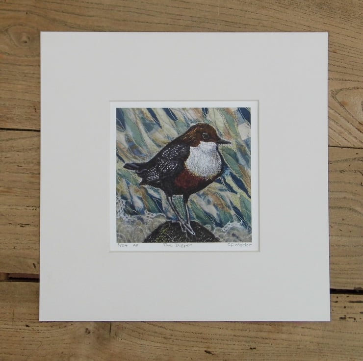 A detailed print of my original embroidery collage of the Dipper. Printed on textured fresco soft white card which brings out the raised quality and texture of the original image. Mounted with acid free off-white mount card.