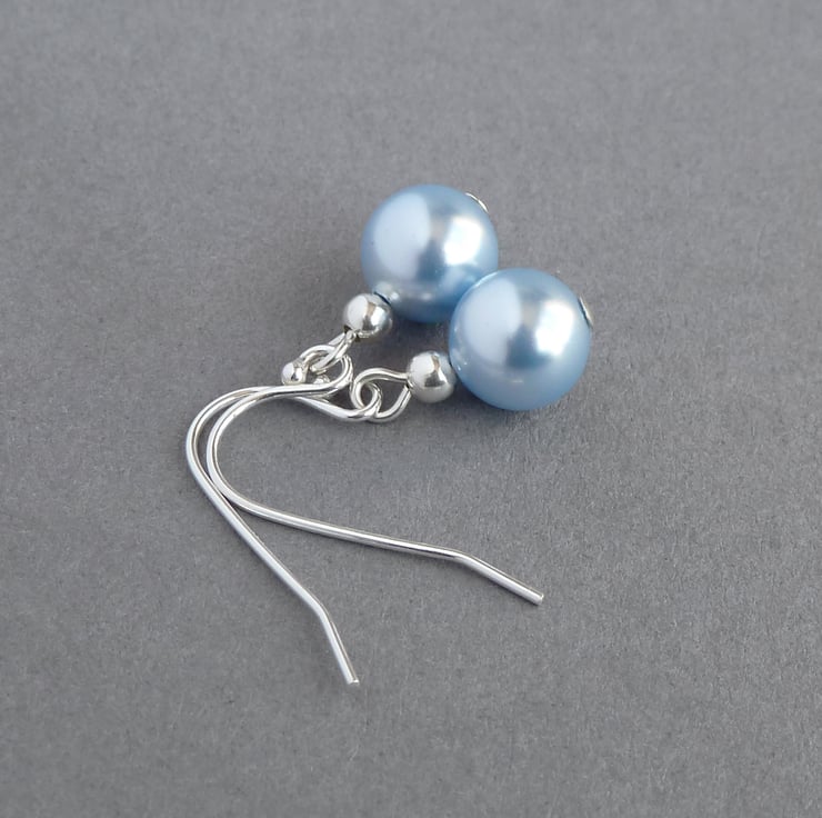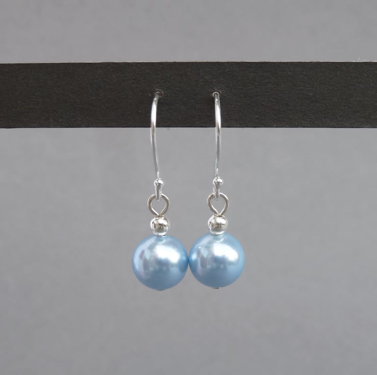 8mm baby blue pearls are used to create these simple, pearl drop earrings. Each pastel blue pearl drop measures 15mm from the bottom of the ear hook. All of the metal fittings used to create these dangly earrings are Sterling silver. Each pair arrives with a pair of plastic stoppers to ensure they stay firmly in place.