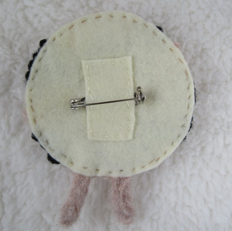 The face and ears are added using another layer of felt and wool, a pink felt nose is added, along with black thread details and cute googly eyes. The legs are needle felted using the same tan coloured wool. The metal brooch pin is securely stitched in place.