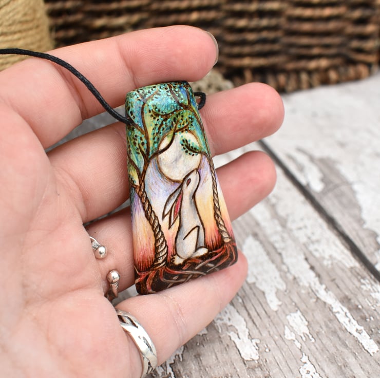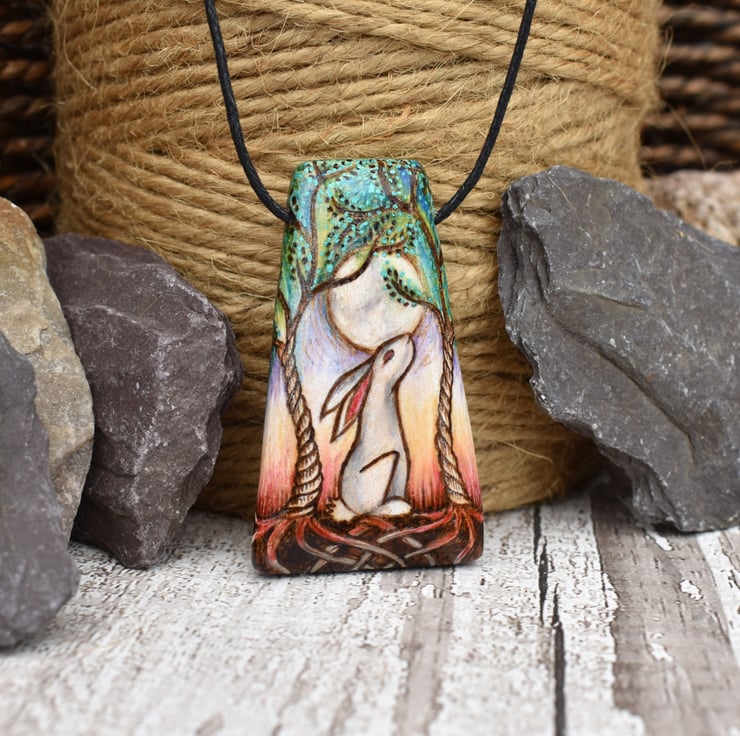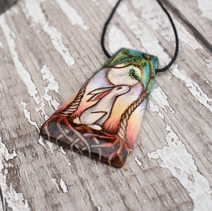 This moon gazing hare pendant has been decorated by hand using pyrography, and coloured using prismacolor pencils in mainly pastel shades. It features two twisted trees, with a milky grey hare and moon in the centre. It would make a great birthday or wood anniversary gift.