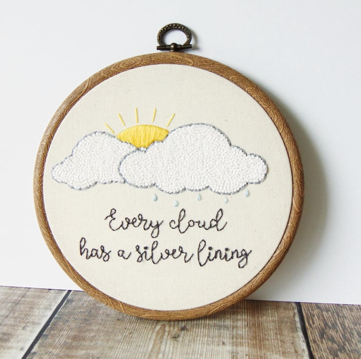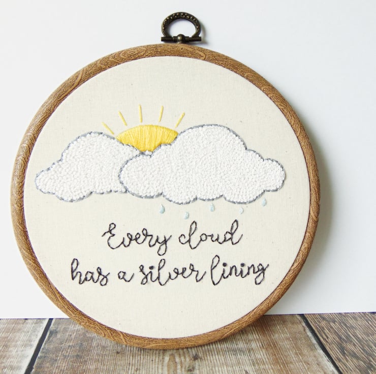 This gorgeous 'Every Cloud Has A Silver Lining' hoop is an original design by The Flossy Stitch. It features two giant fluffy white French knot clouds, each lined with silver thread and set behind them is a yellow sunshine. This hoop is entirely hand stitched to order, set in a six inch embroidery hoop and sewn into seeded oatmeal coloured fabric.