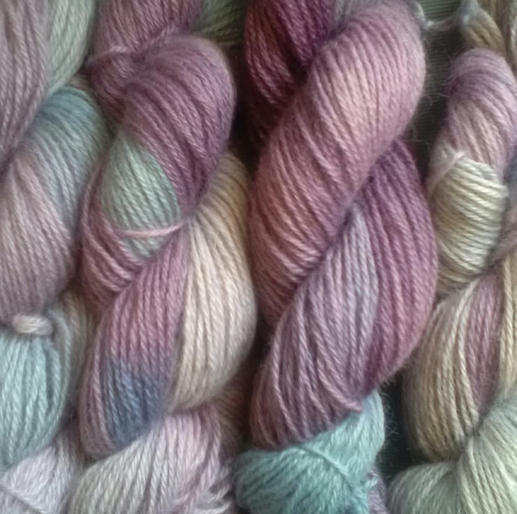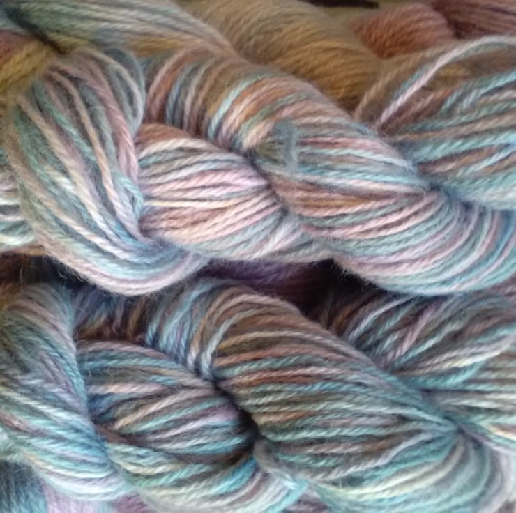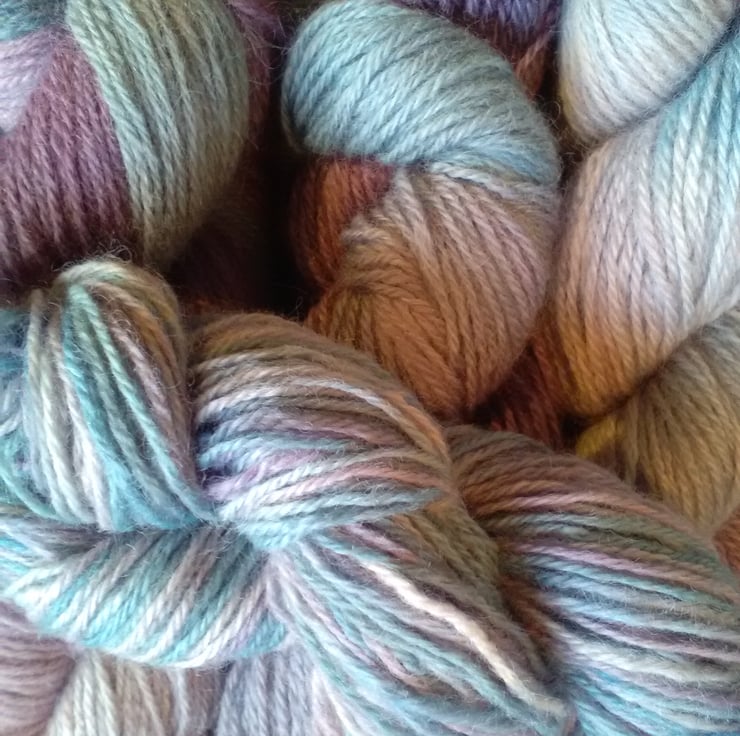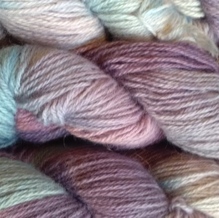 This beautiful 100% Wensleydale wool has been hand dyed in a subtle mix of blues, lavender and lilac