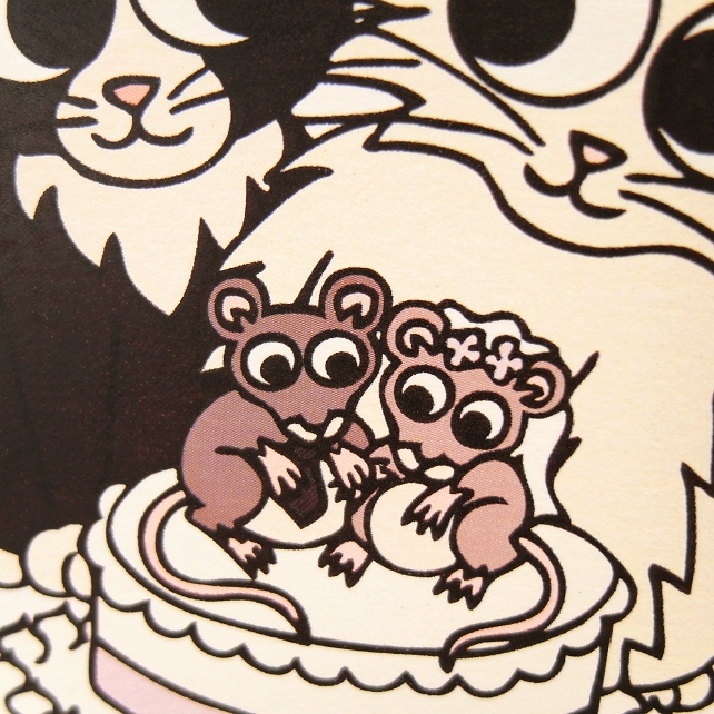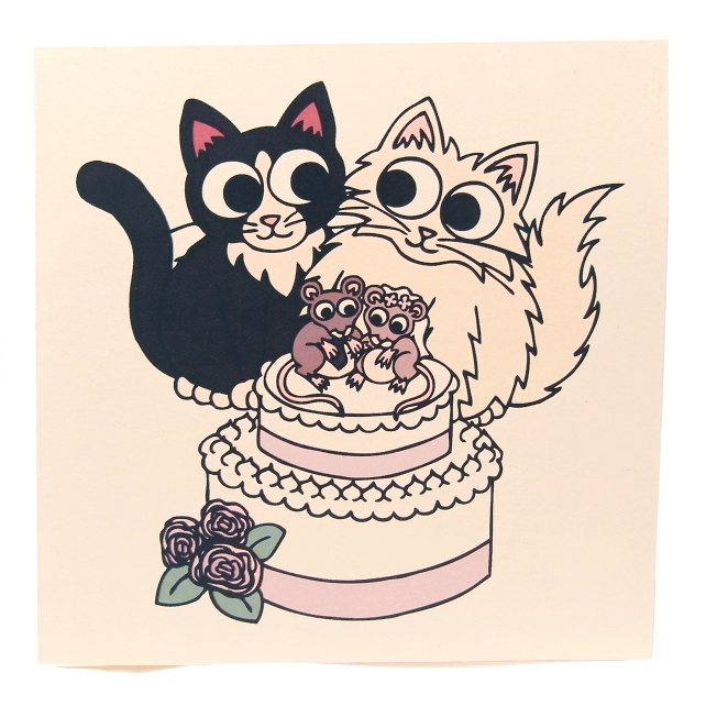 A pair of cute cats are sat together on their wedding day, one black and white cat, and the other a white longhair kitty. They lovingly gaze into each other's big eyes, with their wedding cake in front of them. On top of the wedding cake, decorated with lilac ribbon and roses, are two little mice stood like cake toppers, one mouse wearing a black tie, the other mouse with a white veil.