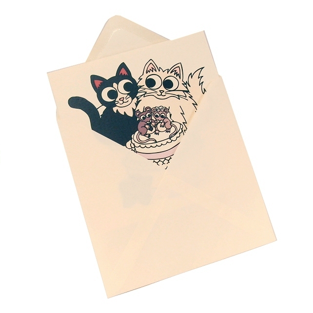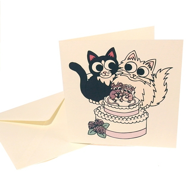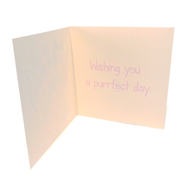 This original cartoon cat design by Kim Onyskiw is printed on a 15cm x 15cm (6" x 6") square ivory card, and comes with an ivory envelope. The inside of the card has the message "Wishing you a purrfect day" written in lilac.