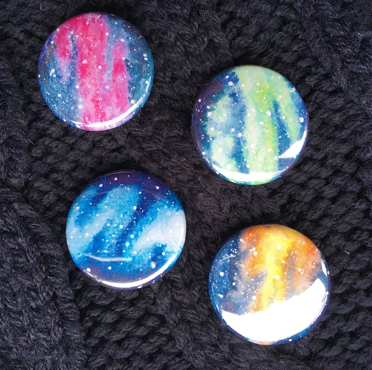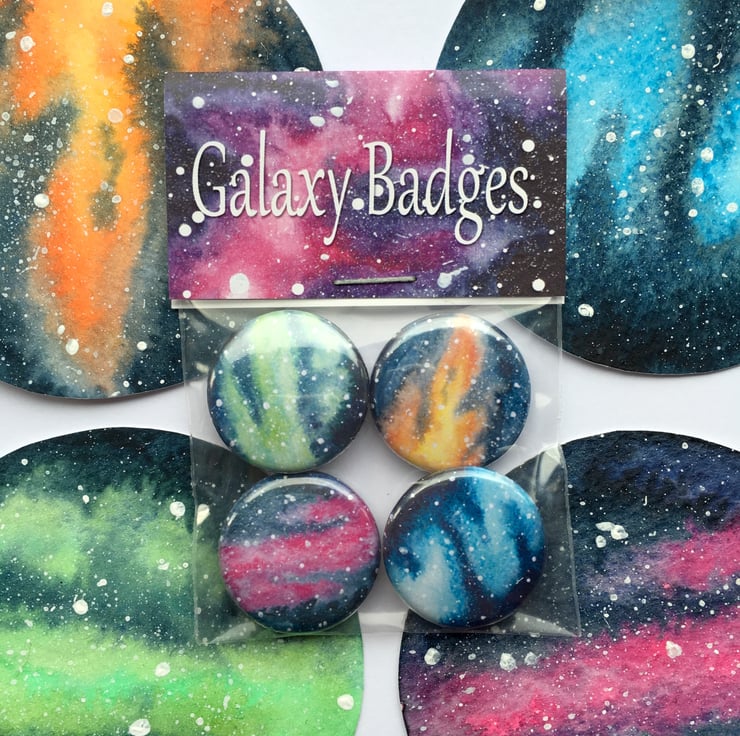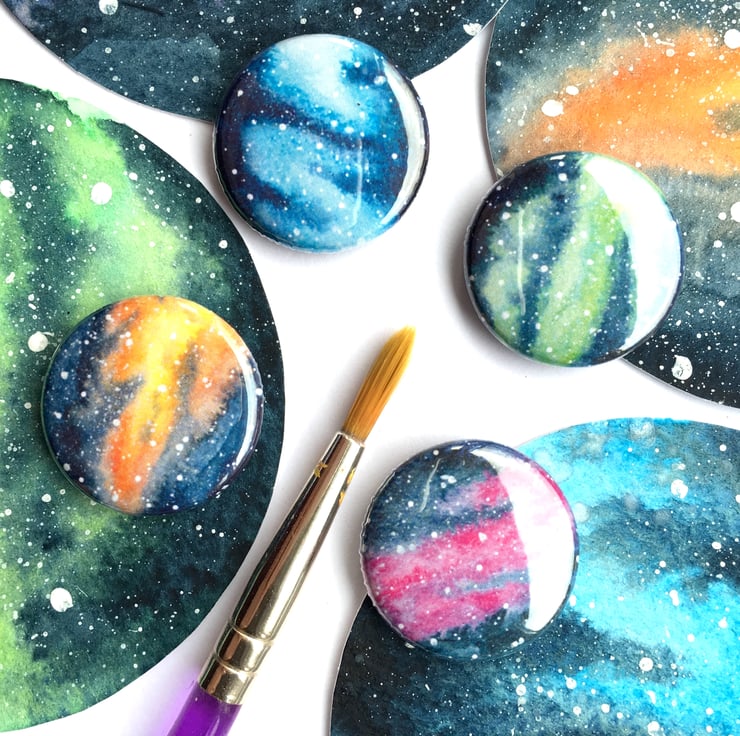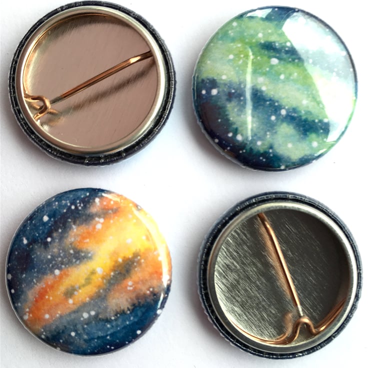This Galaxy badge Pack is made up of 4 button badges, each one with a different galaxy hand painted using Winsor and Newton Cotman watercolours and white acrylic paint. Each badge is 25mm in diameter.