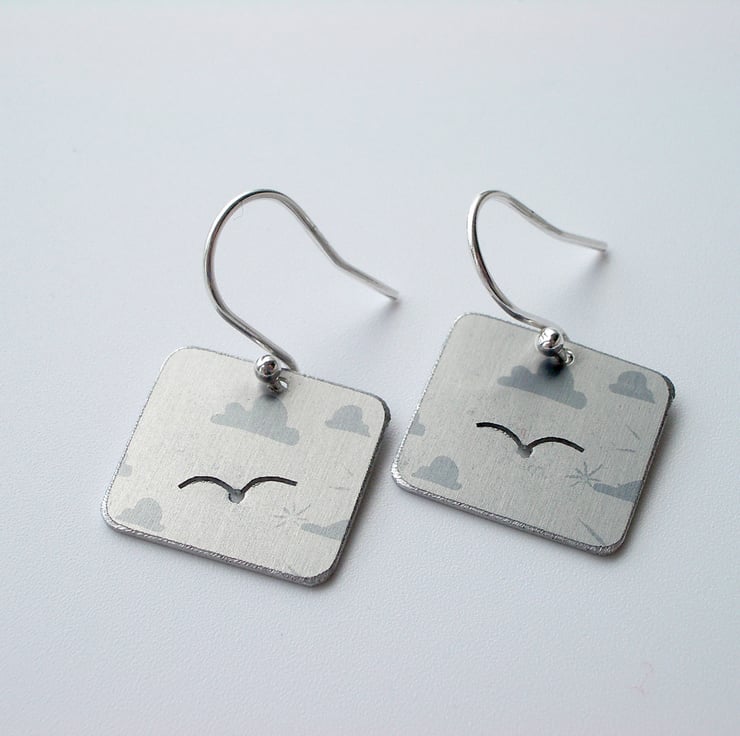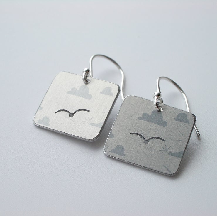 These square earrings are hand made from anodised aluminium which I have printed with cloud prints and dyed light grey. The aluminium is heated to make the dye permanent. I then cut out a seagull shape with a piercing saw. The squares measure 15mm xx 14mm and dangle from sterling silver ear hooks.