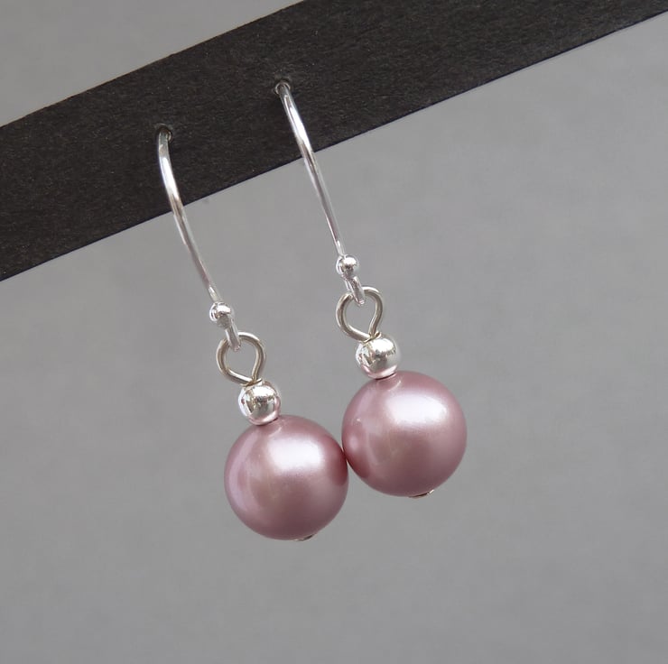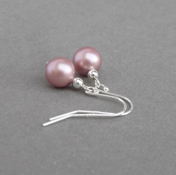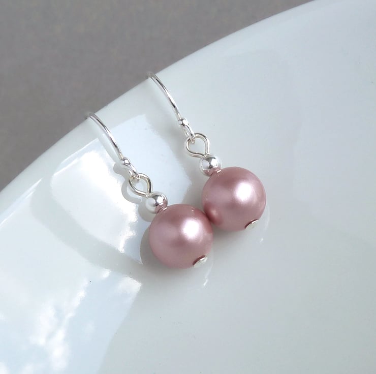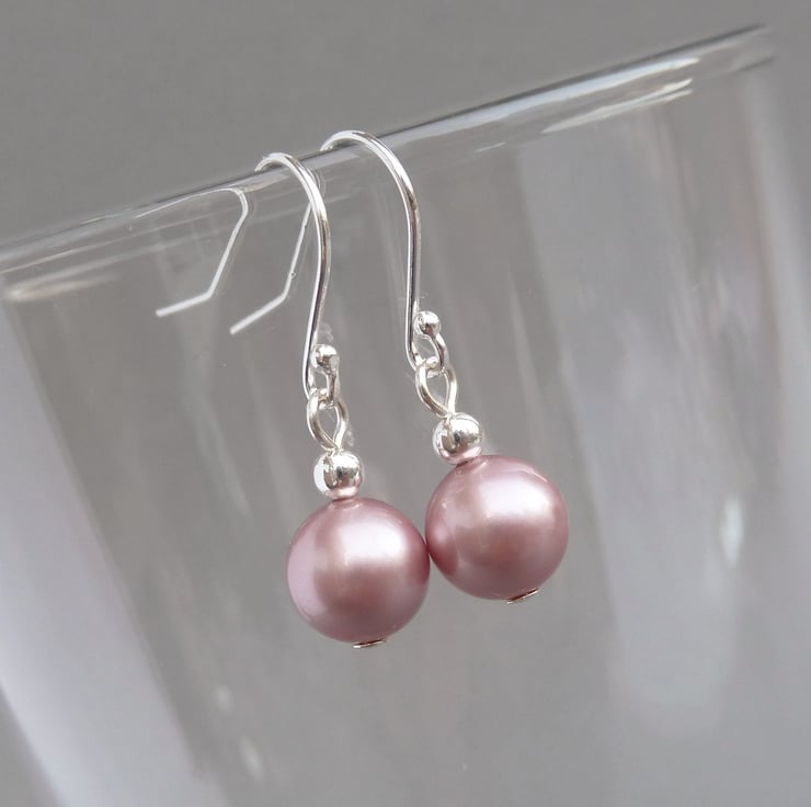 8mm rosaline Swarovski pearls have been used to create these dusky pink pearl drop earrings. These lustrous, rose pink pearl earrings are ideal for finishing off an outfit and make great gifts.