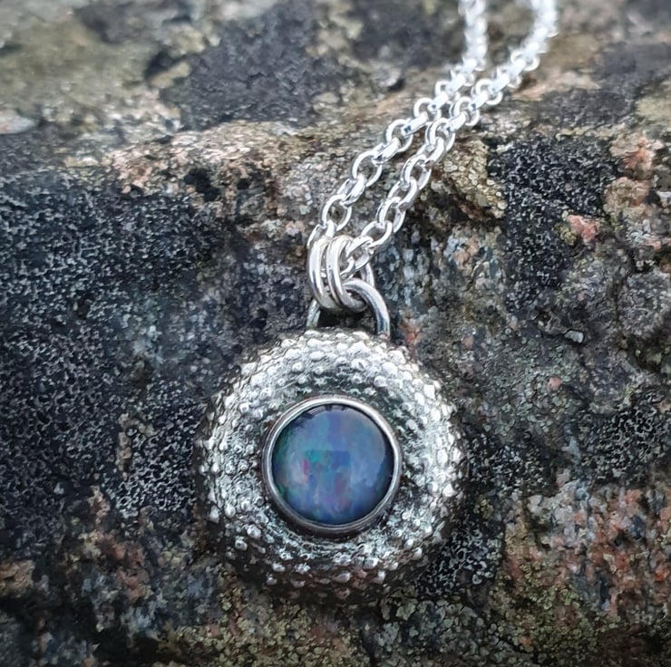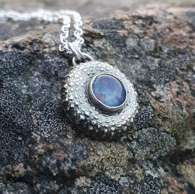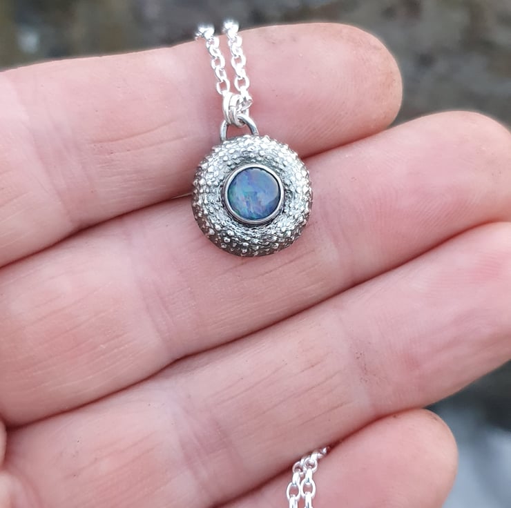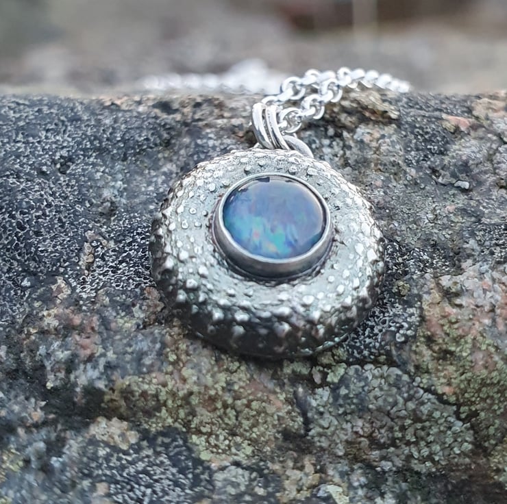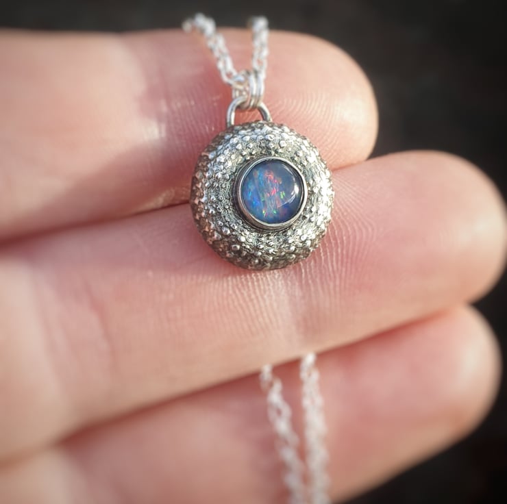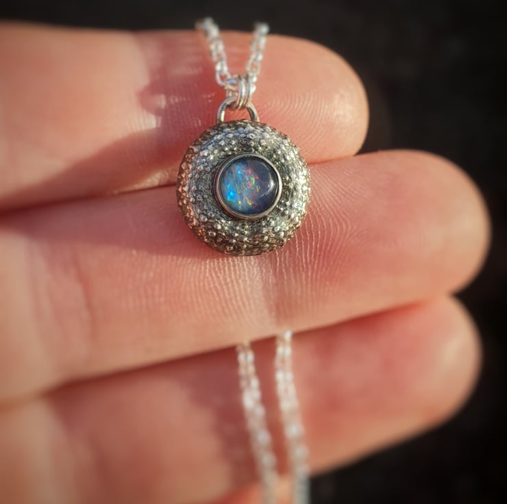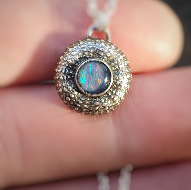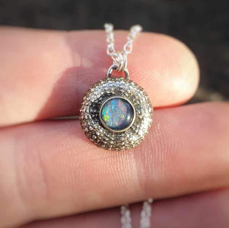 This pretty necklace is made from a solid fine silver sea urchin, in its center is a stunning 6mm round Australian Opal triplet.