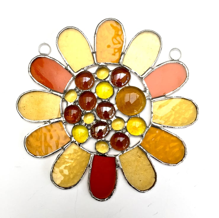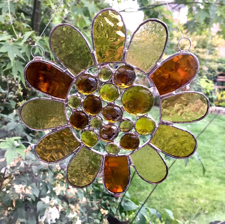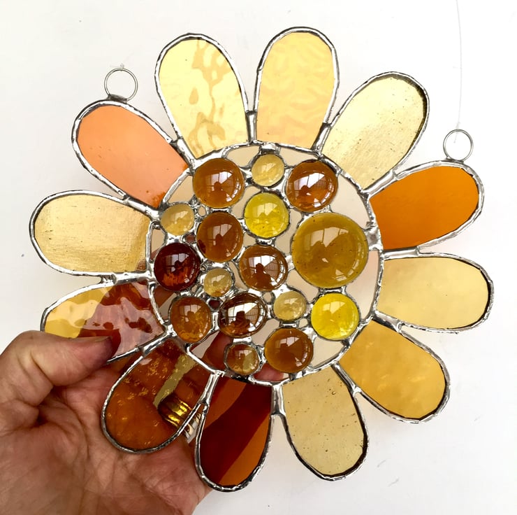 Each of the 12 daisy petals measure 3 cms by 4 cms and there are 16 globs in the centre. The overall size of the suncatcher is 17.5 cms in diameter. Each piece has been copper foiled, soldered and left with a silver finish. Two rings and a short length of fishing line have been attached for hanging purposes.