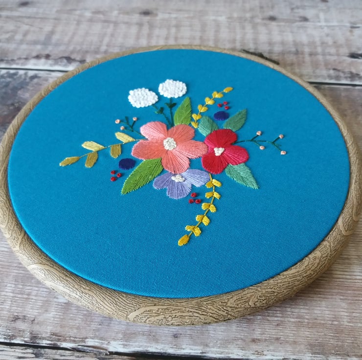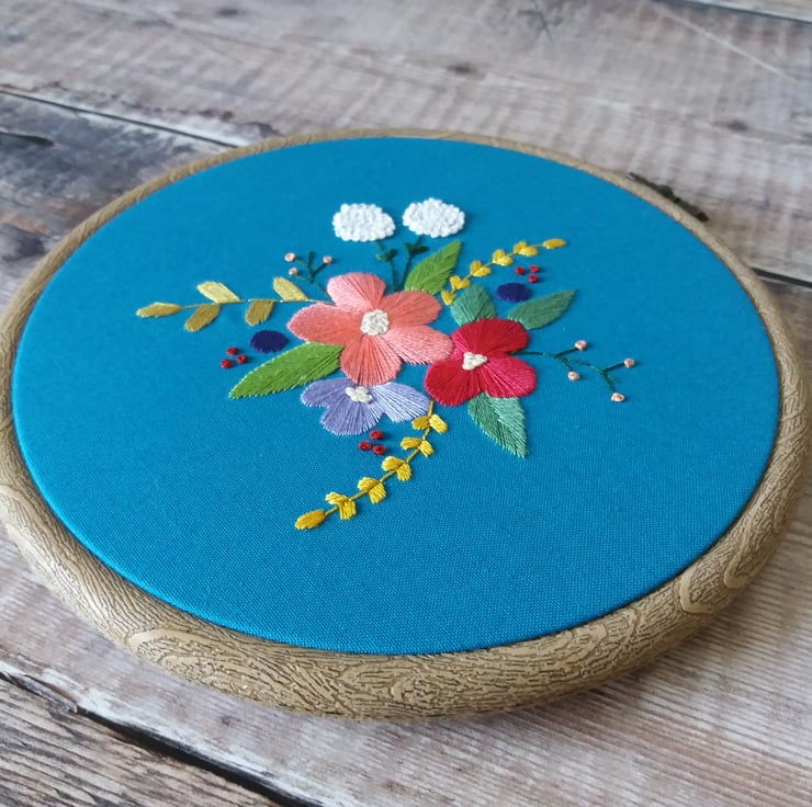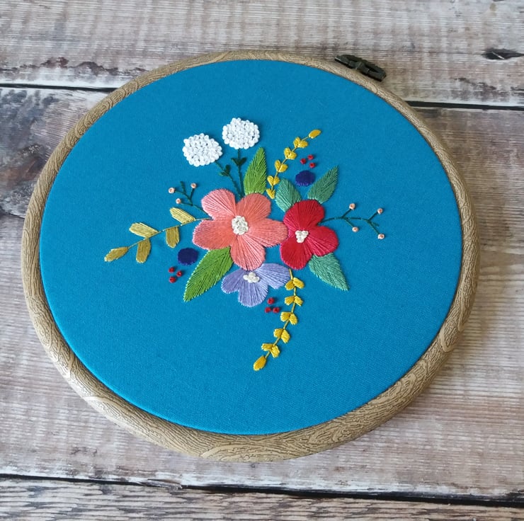 This beautiful hand stitched hoop features an original floral sketch created by me which I have transformed into hand embroidery hoop art. It is a motif of flowers including hydrangeas and green foliage, sewn in a mix of pinks and purples onto a bold teal cotton fabric. These are made to order, set in a six inch hoop and including ribbon for hanging.