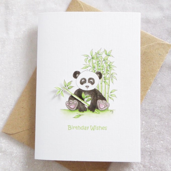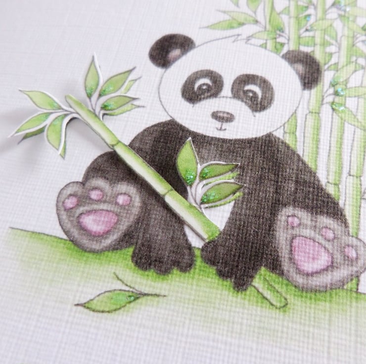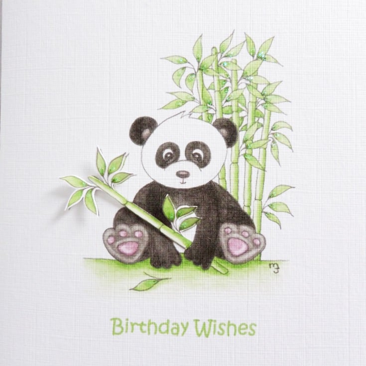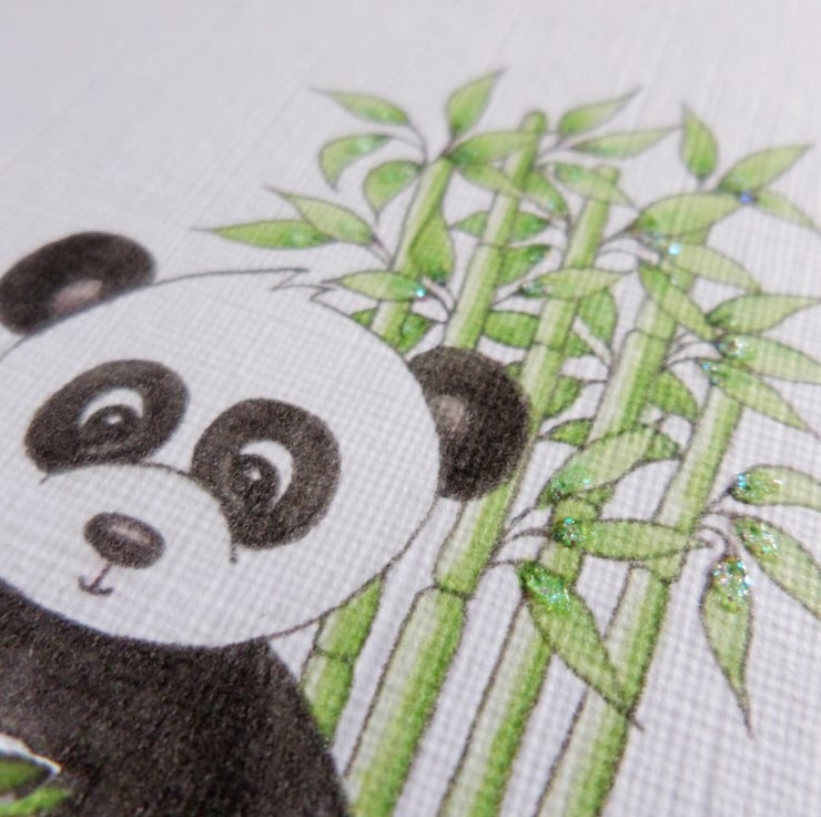 This cute panda bear card has been designed using my own original watercolour illustration. The card has been printed out onto good quality linen embossed card and decoupaged up in parts. The card has been finished off with a little glitter detail.