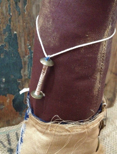 She has lovely vintage trinkets a little metal cotton reel necklace, and trinkets hanging from her apron.