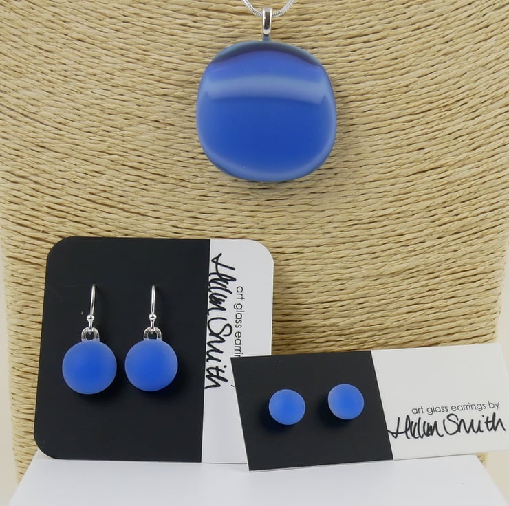 Periwinkle blue satin finish glass stud earrings with sterling silver fittings, presented on my signature card. Created by me in my home studio on the Wirral peninsula, NW England.