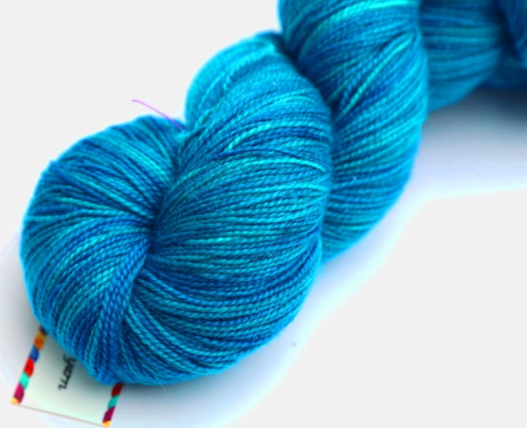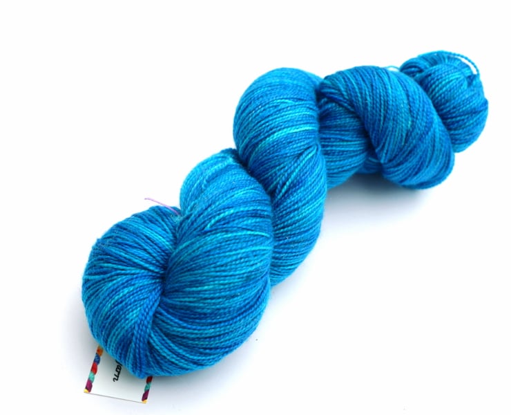 Bright cyans and sky blues with silver stellina sparkle. This is a soft, lustrous 4-ply weight yarn with added stellina sparkles, that are almost impossible to capture accurately in photographs (they show as whitish flecks). In real life they catch the light and add a little sparkle. This skein contains a join. This skein comes from the 'impossible to photograph accurately' pile - in reality the colours are a lot more saturated. Photographs have been taken and edited in bright but wintery natural light.