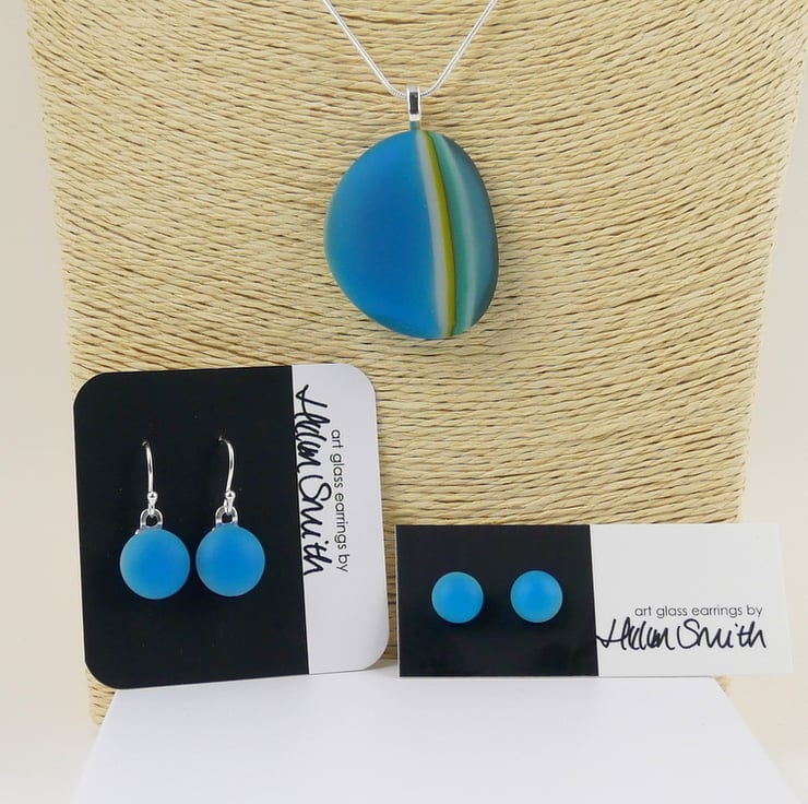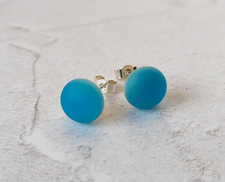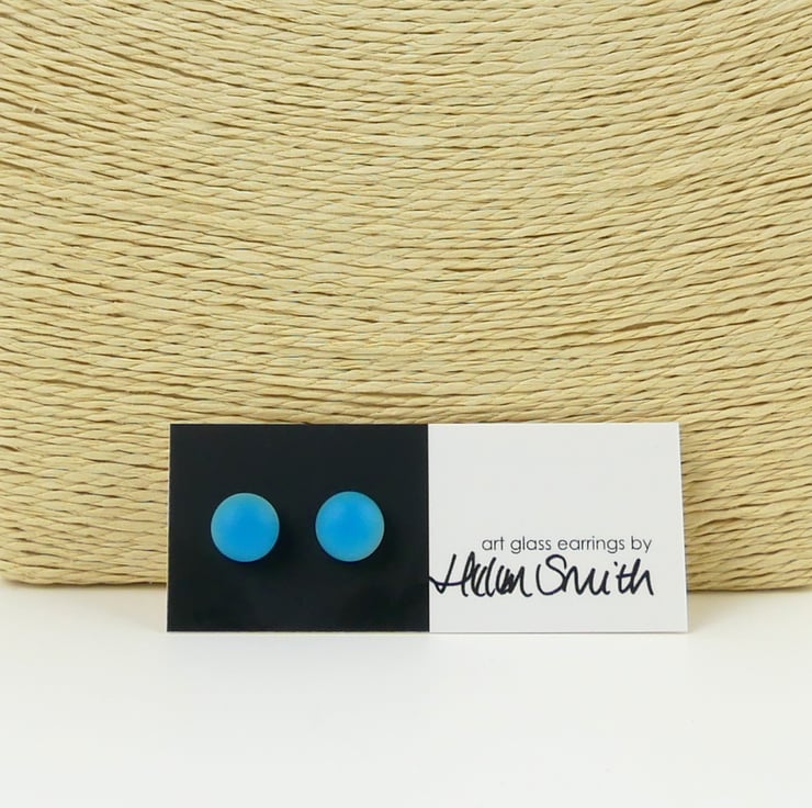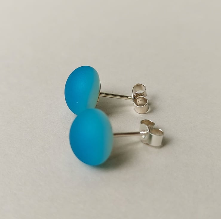 The fused glass earrings are a lovely bright turquoise with a subtle matt finish, and are completed with sterling silver fittings. The studs are made from two contrasting layers of hand cut glass fused together in my kiln, then sandblasted and fired a second time to give the glass a beautiful satin finish.