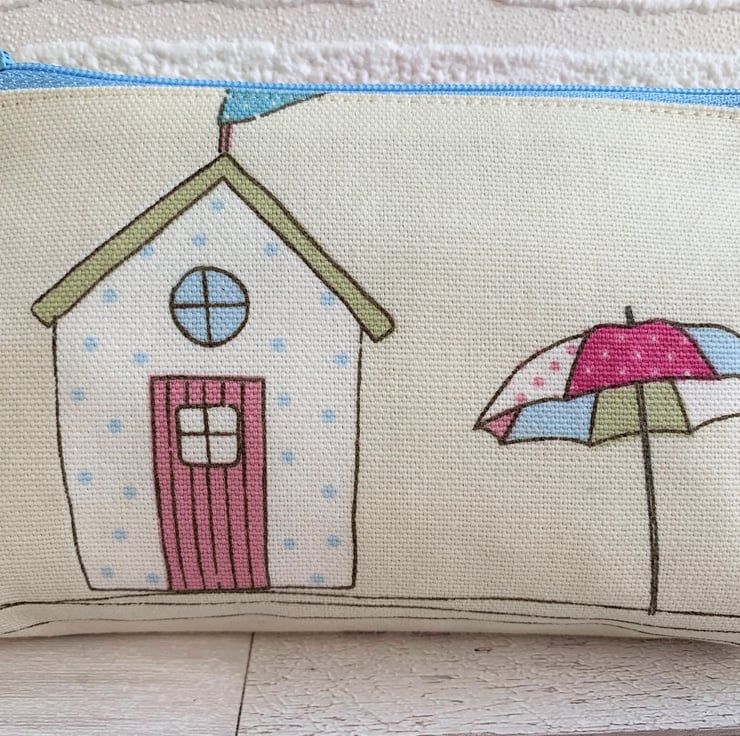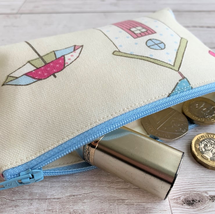A lovely large coin purse in pastel-coloured beach hut themed fabric. The pattern, in pastel shades of blue, white, pink and green on a cream background, features a beach hut with a parasol next to it. The beach hut is white with pale blue polka dots, a pink door and a green roof. The coin purse fastens with a co-ordinating pale blue zip and is lined with cream fabric. The base of the purse is boxed to give a spacious interior.