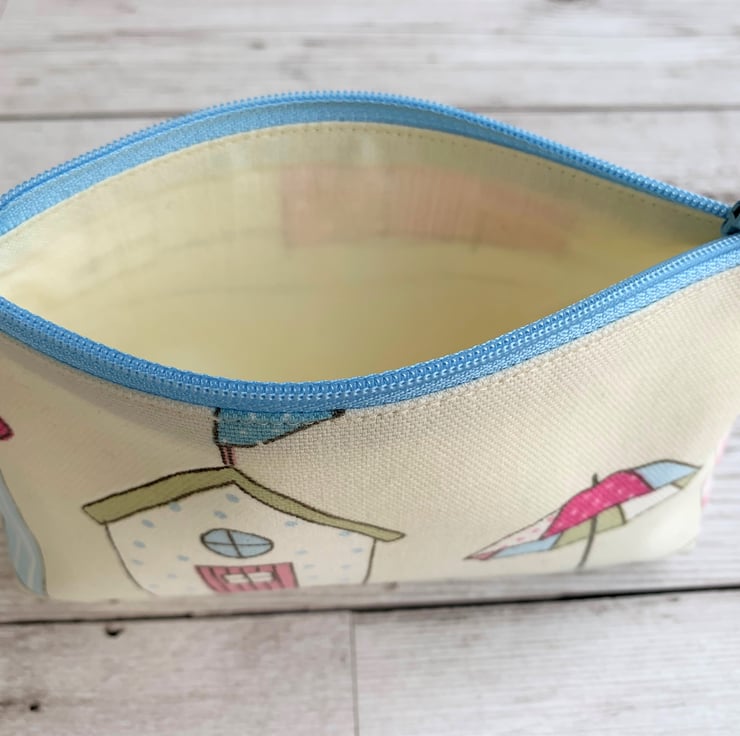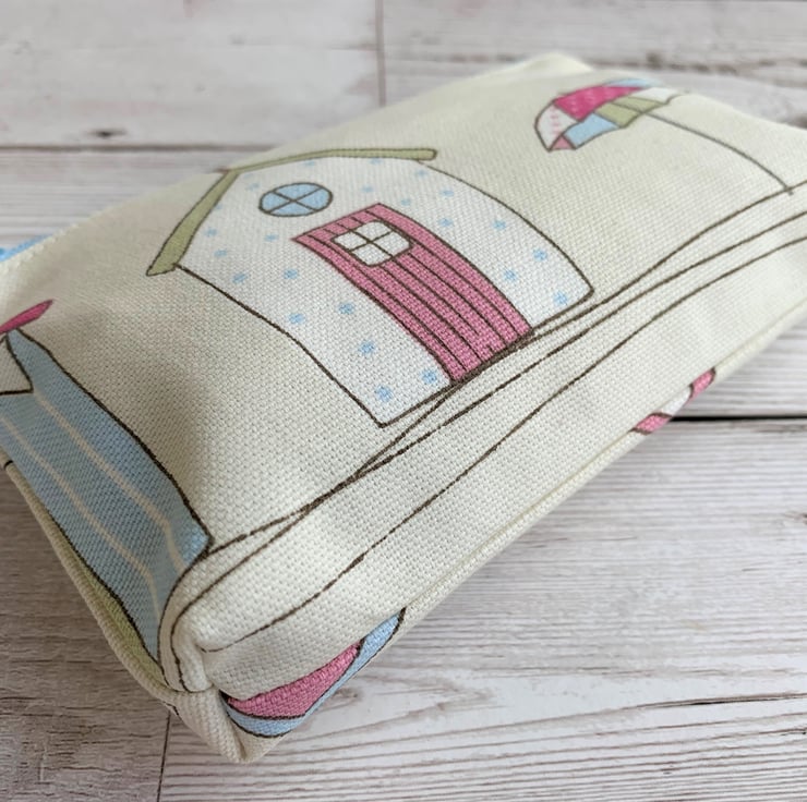 This large purse could be used as a coin purse and is large enough for bank cards and keys. It is also large enough to be used as a small make up bag or as a mobile phone pouch. The purse, with its beach theme and pastel colours would make a lovely gift, particularly for anyone who loves beach huts.