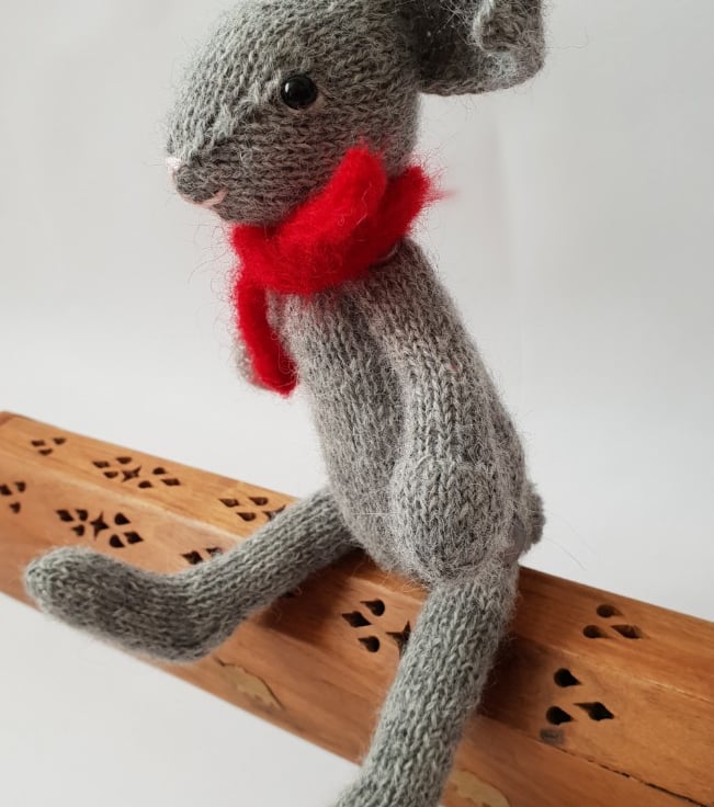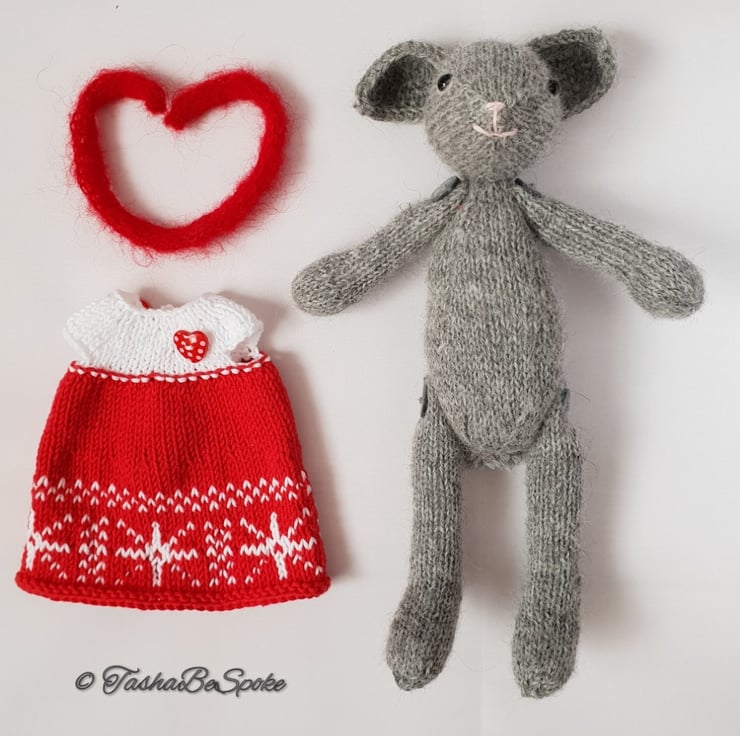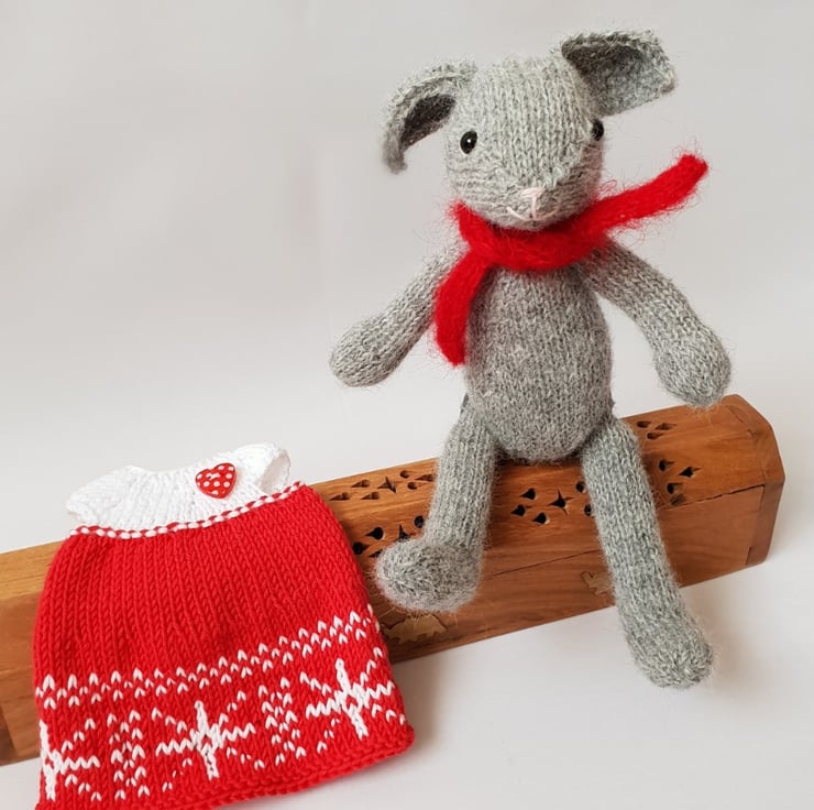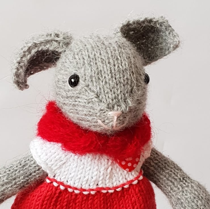 Nina is hand knitted from soft pure alpaca yarn. She has a lovely red and white cotton dress and a red mohair scarf to keep her warm.