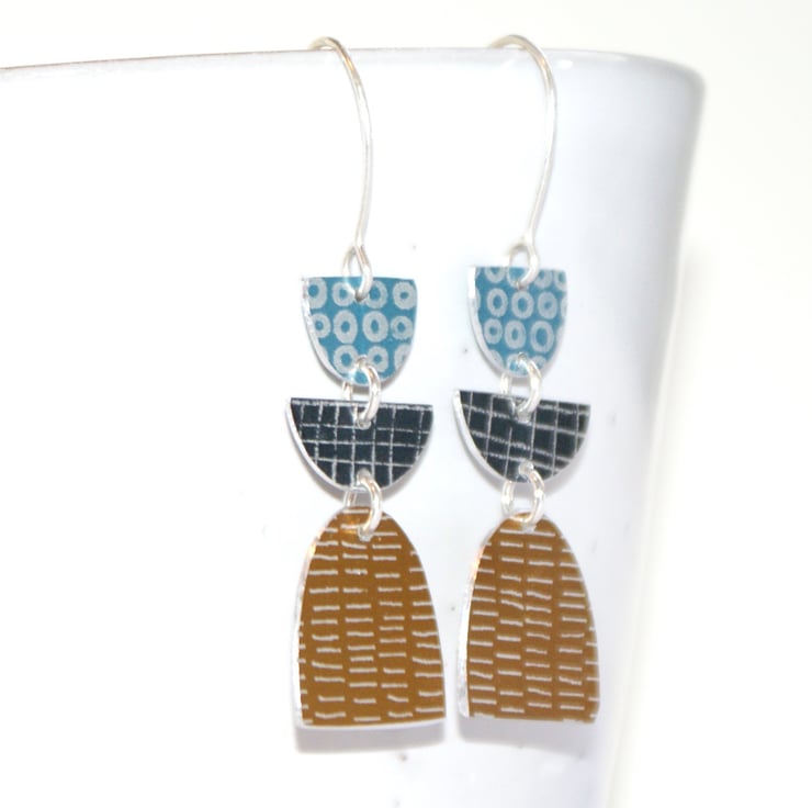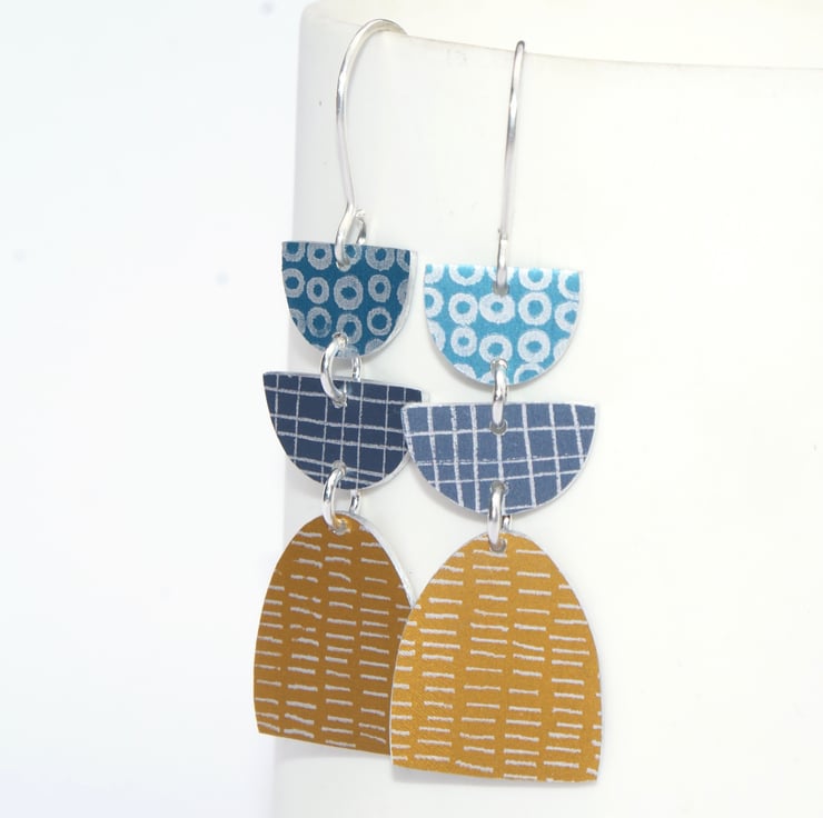 A colourful pair of earrings handmade from sterling silver and anodised aluminium. The aluminium pieces have crosshatch, circle, and line patterns which have been applied to the metal, then dyed. The ear wires are hand made from sterling silver.