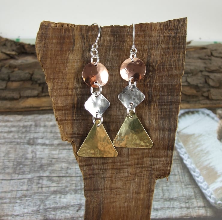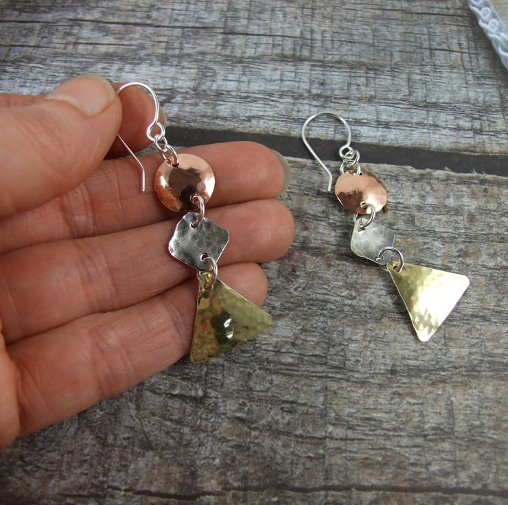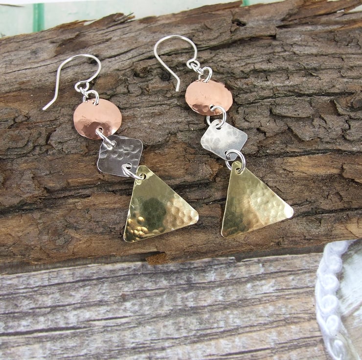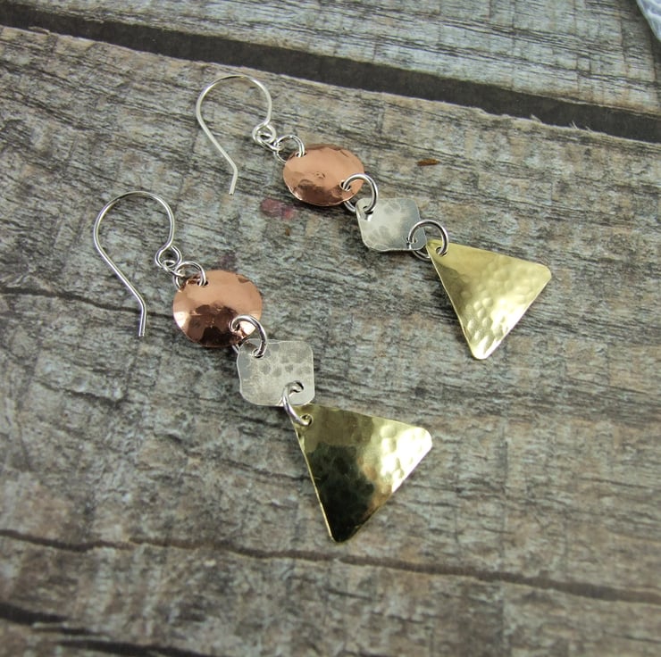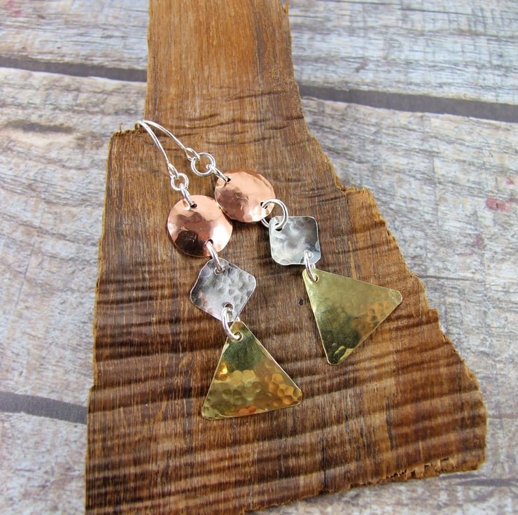 Geometric Shapes Earrings, Mixed Metals Sterling Silver, Copper and Brass Dropper Earrings