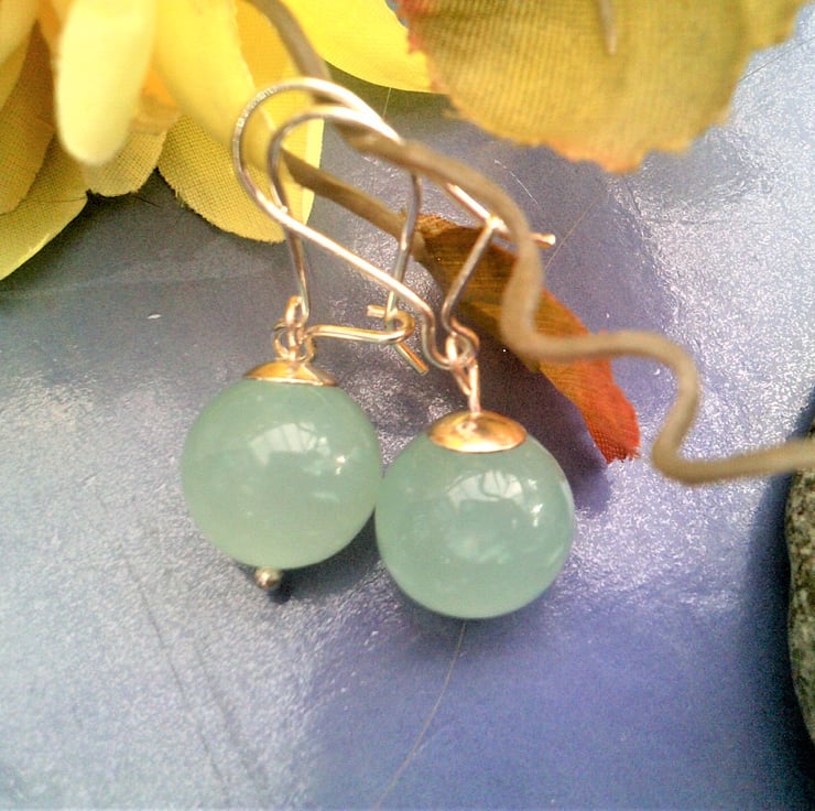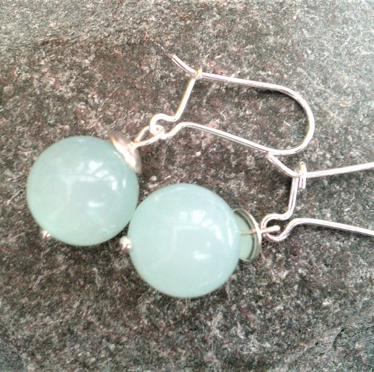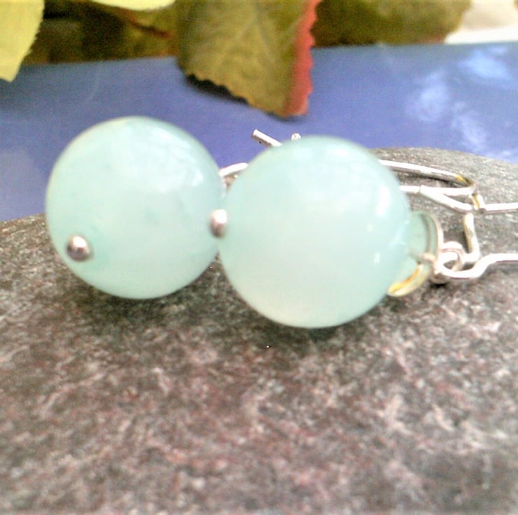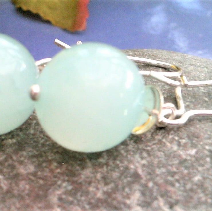 Blue quartz earrings made with 12mm blue quartz stones and silver tone bead caps, all suspended from silver plated kidney wires. The blue on these gemstones is a very pale, delicate blue.