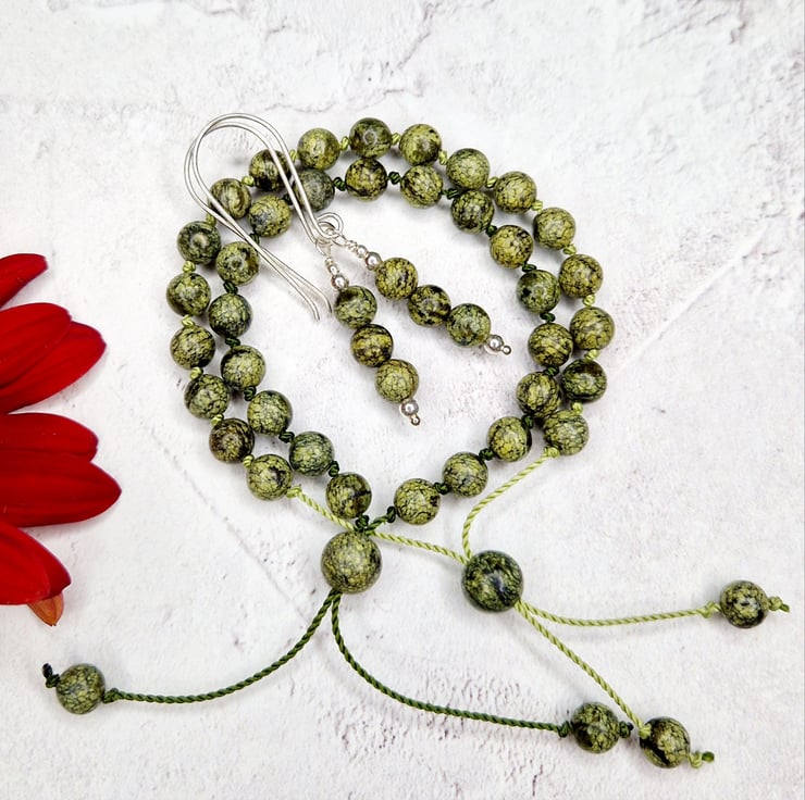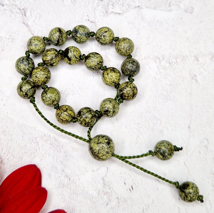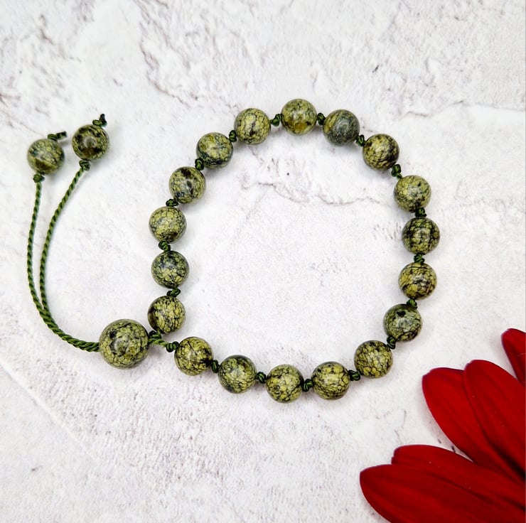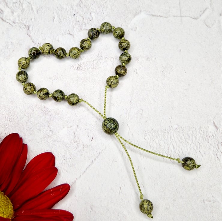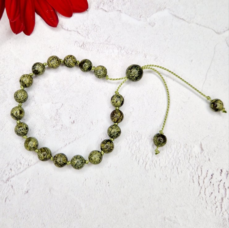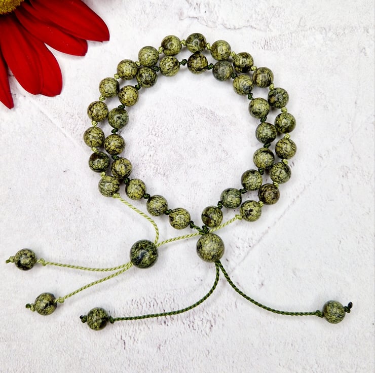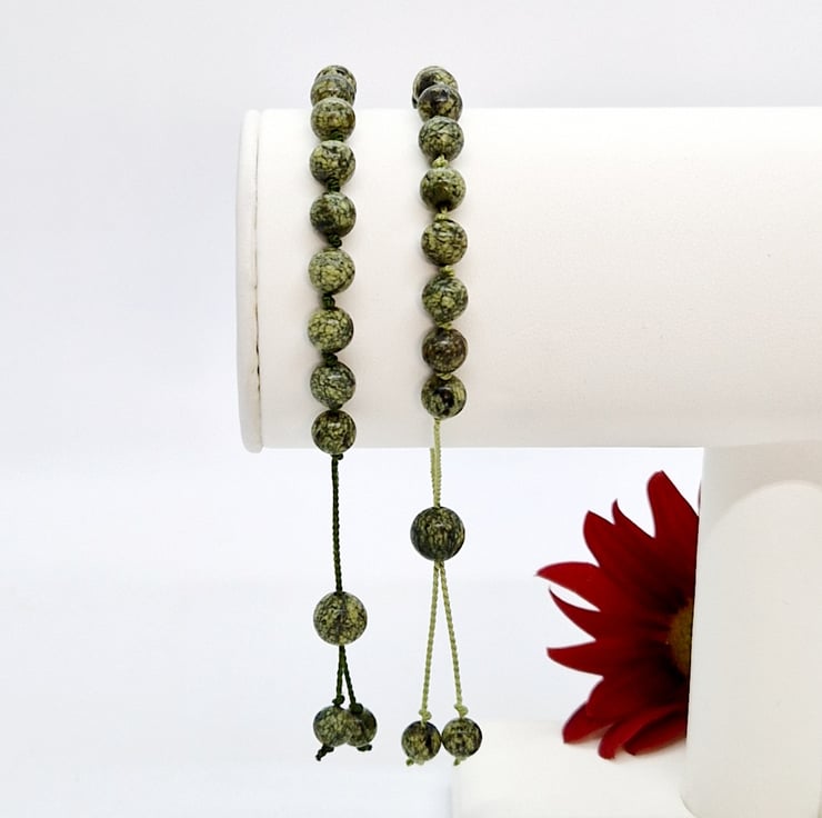There are two colours of silk cord available, Jade and the darker Olive, please choose your option when you order. The cord is hand knotted each side of all the beads except for the single 8 mm bead which acts as the fastener, sliding to adjust the size of the bracelet from 14 cm to 24 cm.