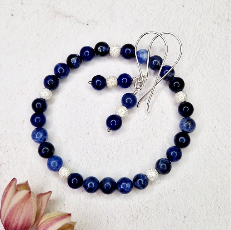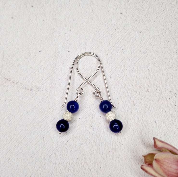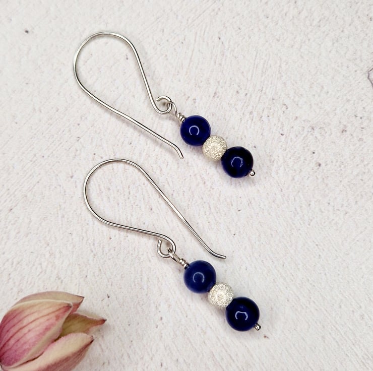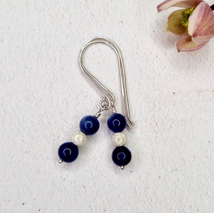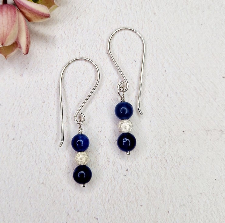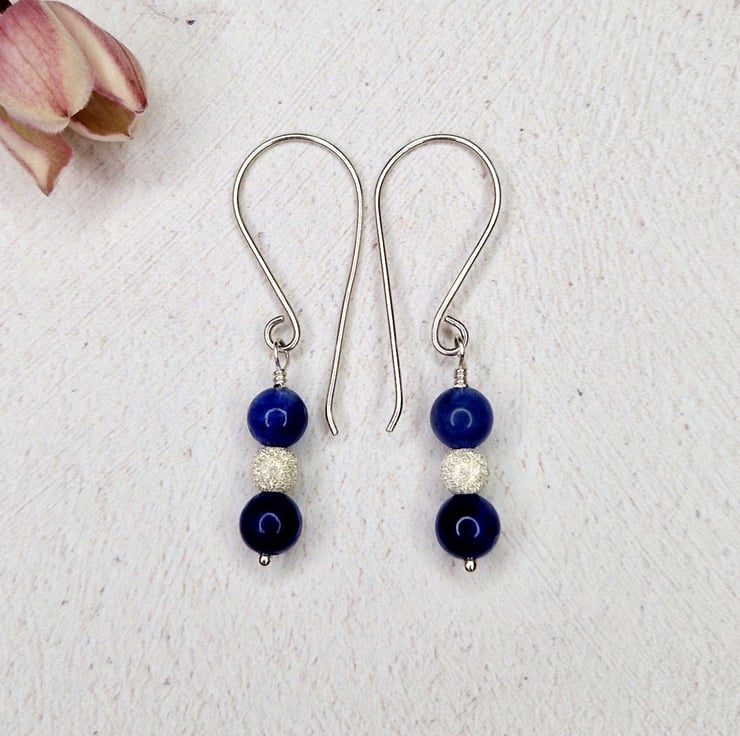 The earrings are made of 6 mm sodalite beads. Each bead is a little different with shades of dark blue with white and paler shades of blue and grey streaks and splashes. There is a 5 mm laser cut (so very sparkly) silver bead placed between the sodalite beads.