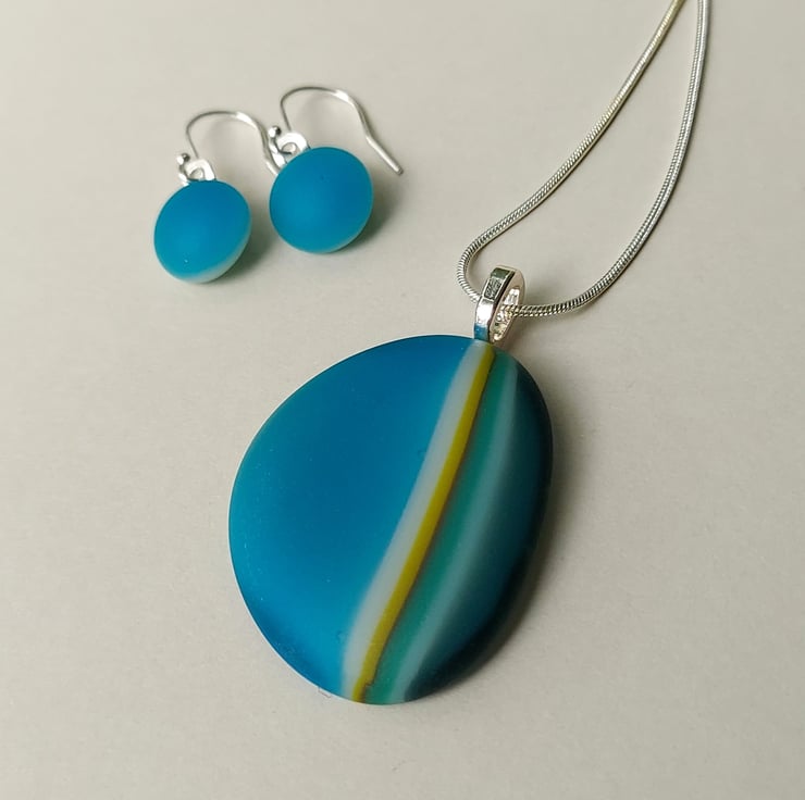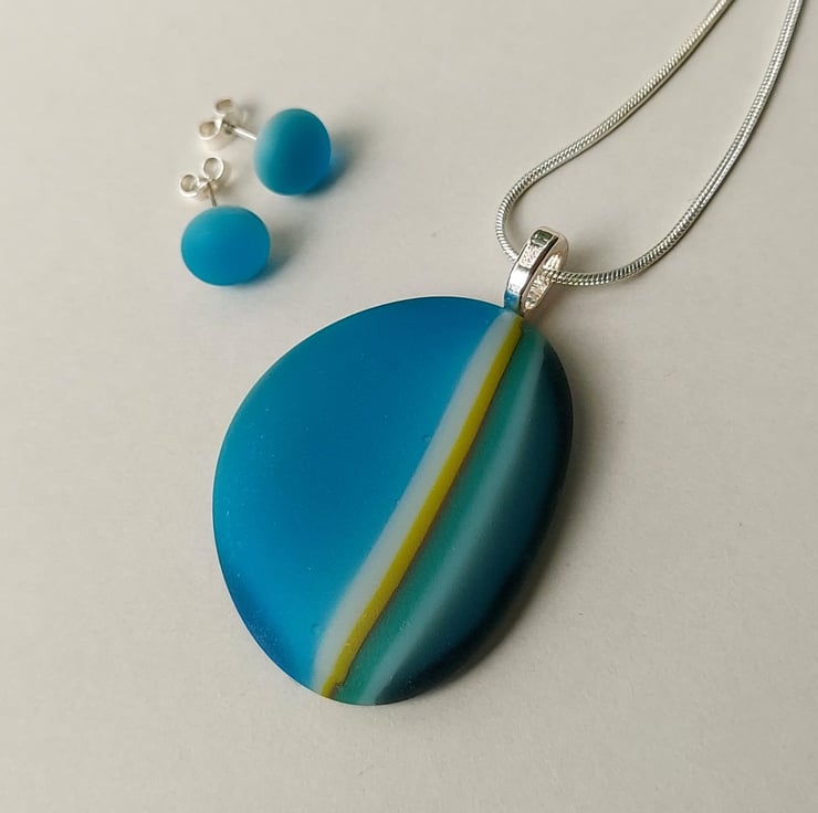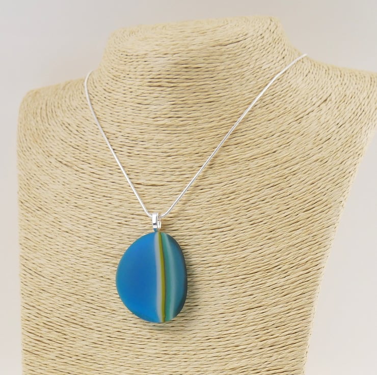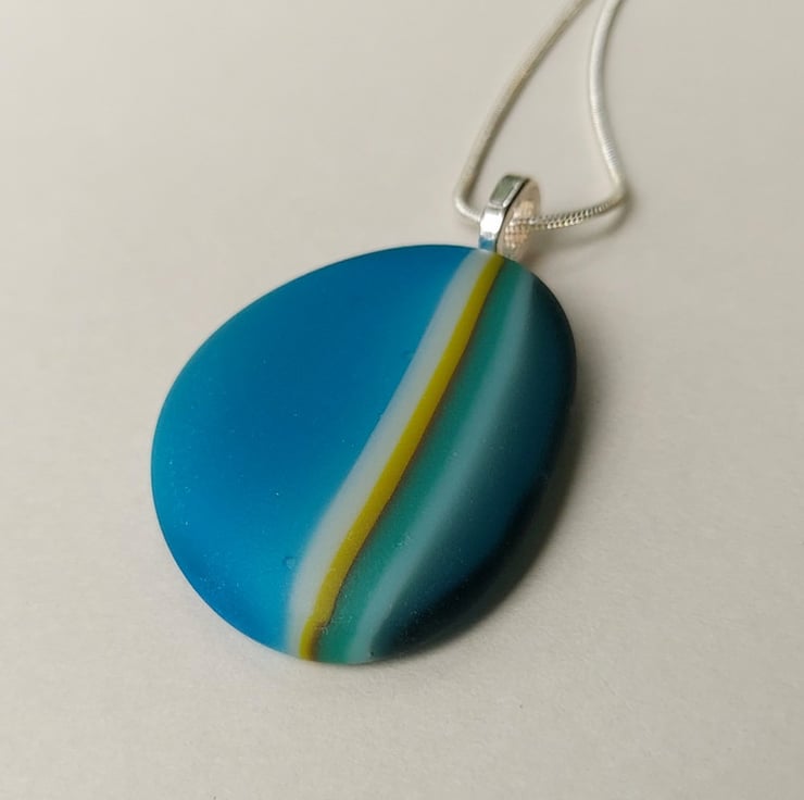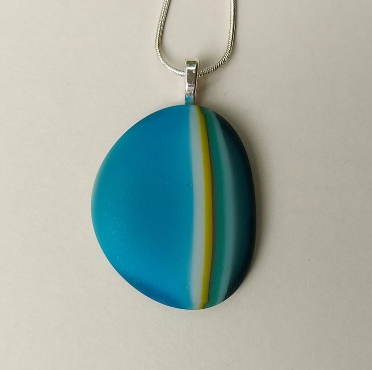 This is vibrant fused glass pendant in shades of turquoise and teal blue with a contrasting stripe of acid yellow. The beautifully tactile glass has a satin finish reminiscent of seaglass or a a sea smoothed pebble, but is much brighter than anything you'd find on the beach.