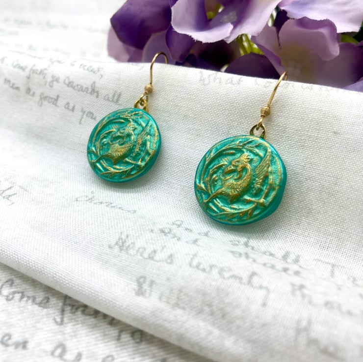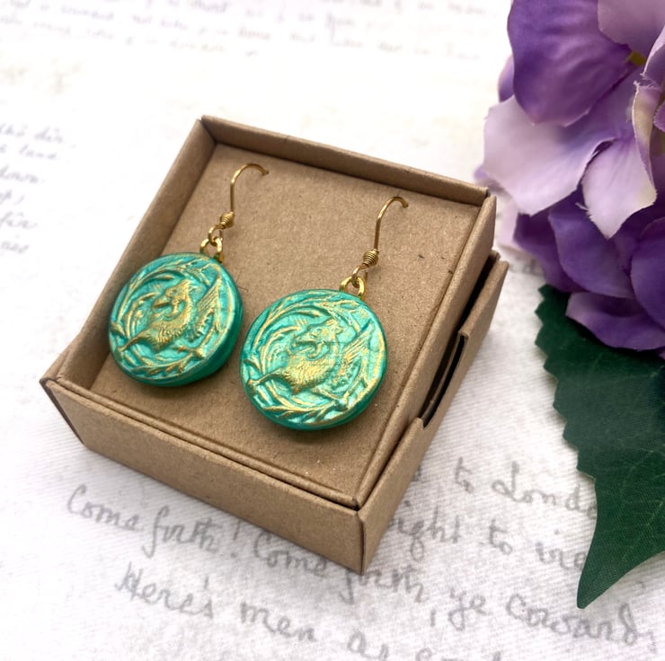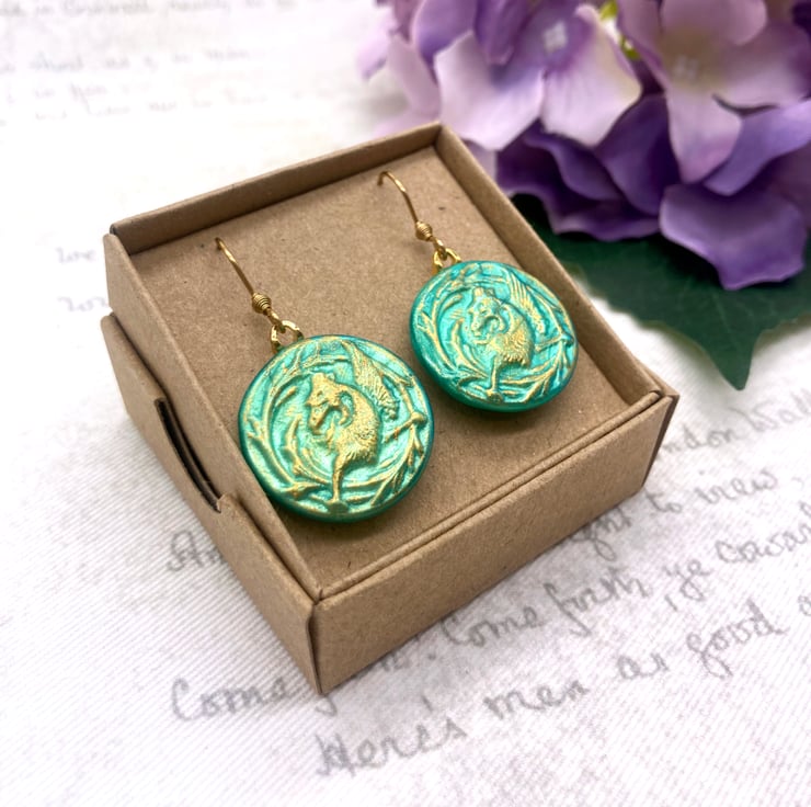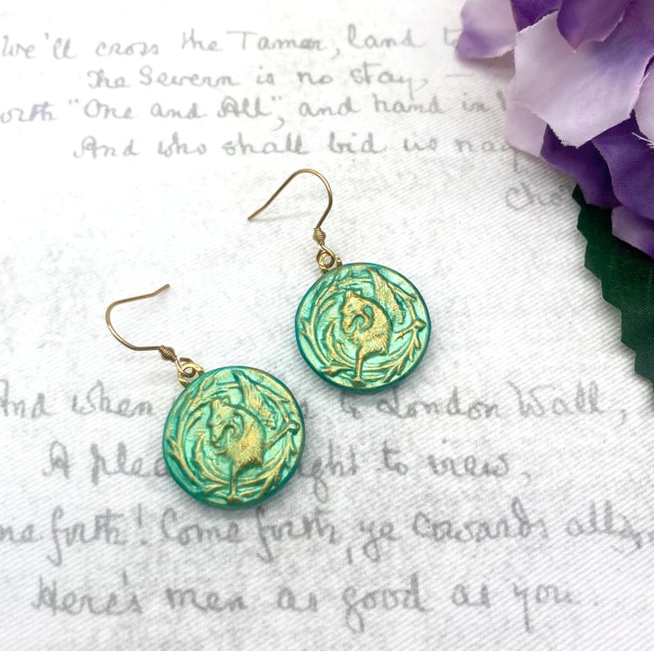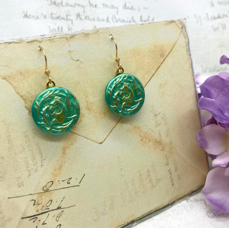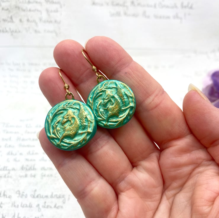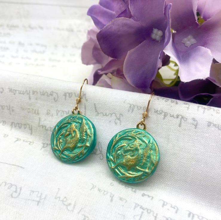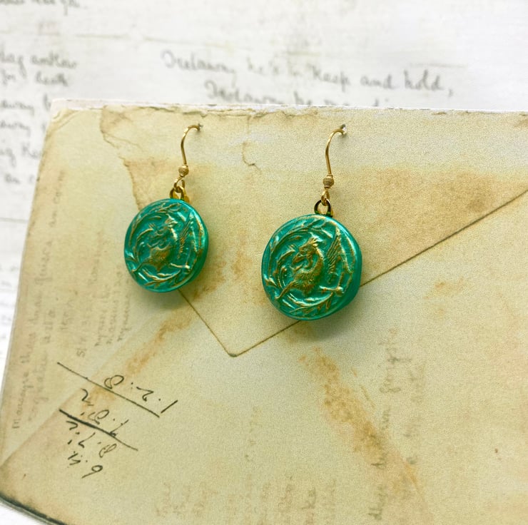 These lovely pair of pale jade coloured earrings feature a Mytholocial beast called a Griffin - often seen in Heraldry and on old medieval documents like maps or Illuminated Manuscripts!