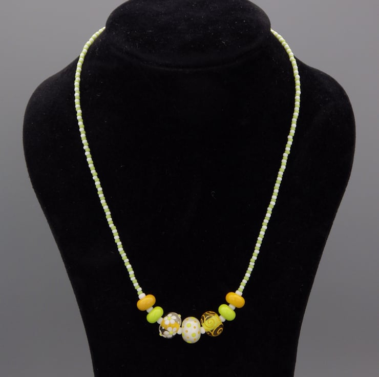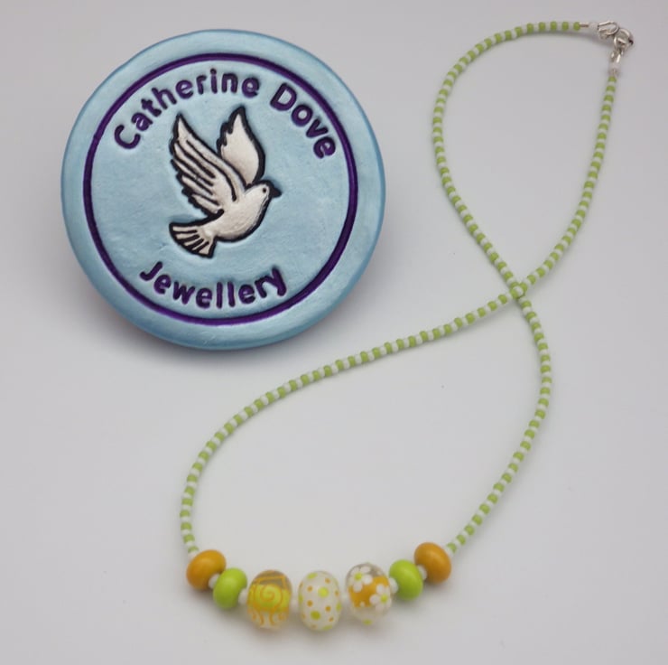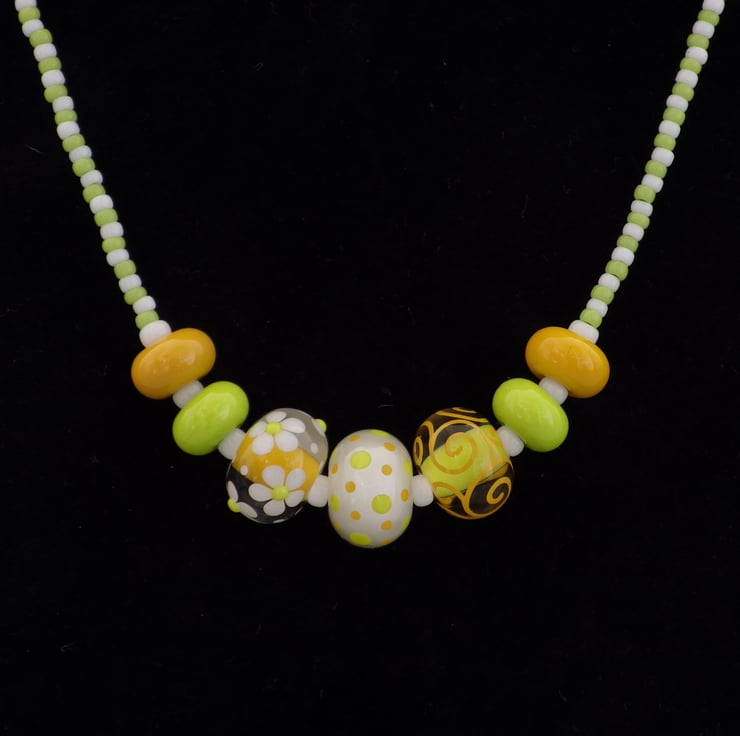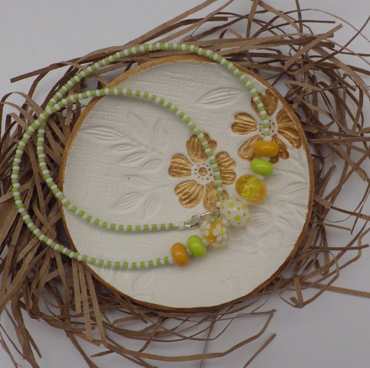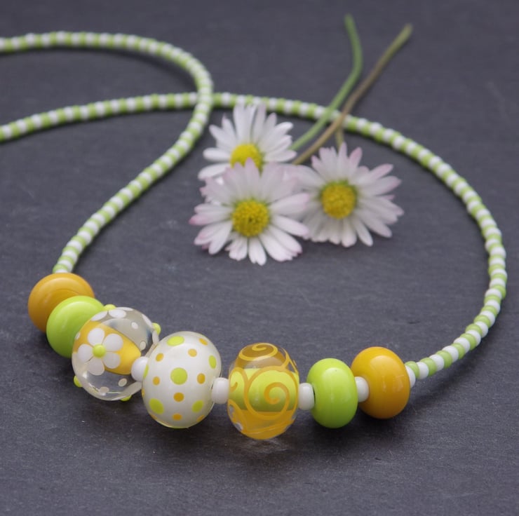 This necklace has been made with handmade lampwork glass beads in a zesty citrus palette. The central three beads all contain lime green, yellow, white and clear glass but are all different, featuring one with a dotty design, one with swirling lines and one with dainty flowers - what unites them is the absolute precision and elegance with which each part of every design is executed. They are framed by handmade lampwork glass spacer beads in green and yellow and the necklace is completed with Japanese seed beads in matching green and white. The beads are strung on Beadalon wire, which is a group of stainless steel wires twisted together and coated in nylon, giving a strong and durable result. The necklace is finished with Sterling Silver findings, including a secure spring ring clasp.