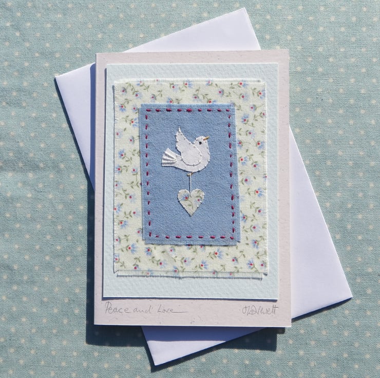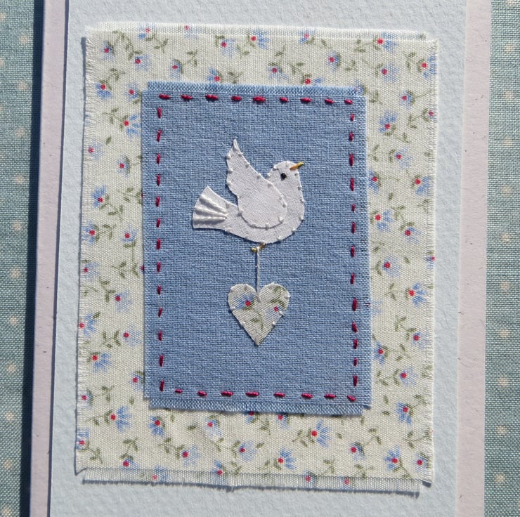 This little applique dove and heart design is made up of very pretty cotton print fabric teamed with a piece of recycled white cotton for the dove motif. Everything cut and stitched by hand, to make a unique and lasting original piece of textile art. Perfect for new baby, first birthday, Christening or to go with baby shower gift. Suitable for weddings or engagement too!