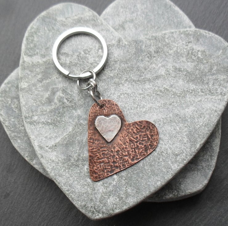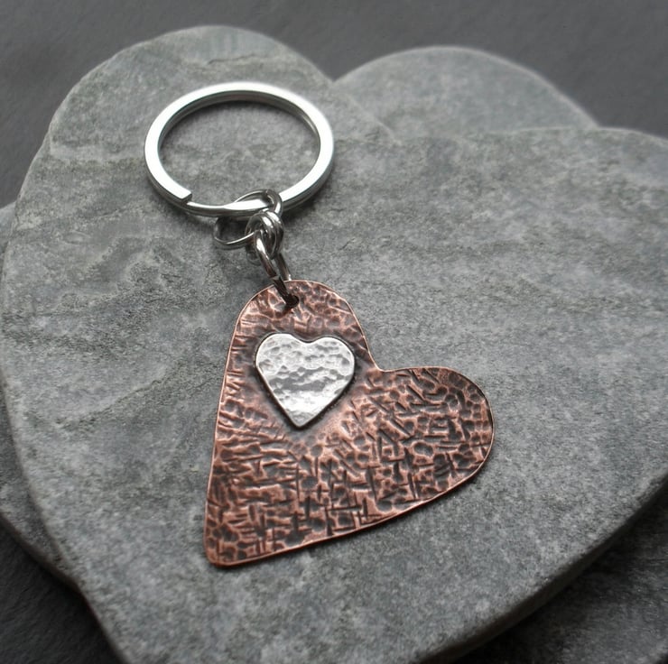This keyring has been made with a heart shape being cut out of a piece of copper with a sterling silver small heart and has been hammered to give texture