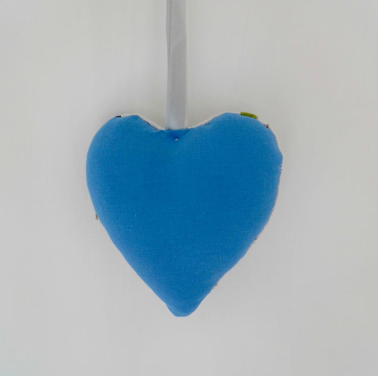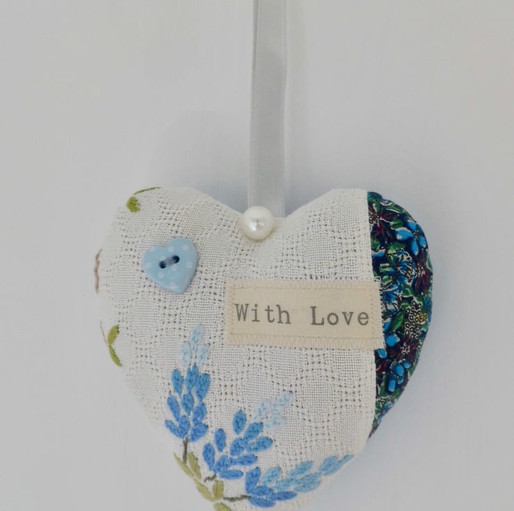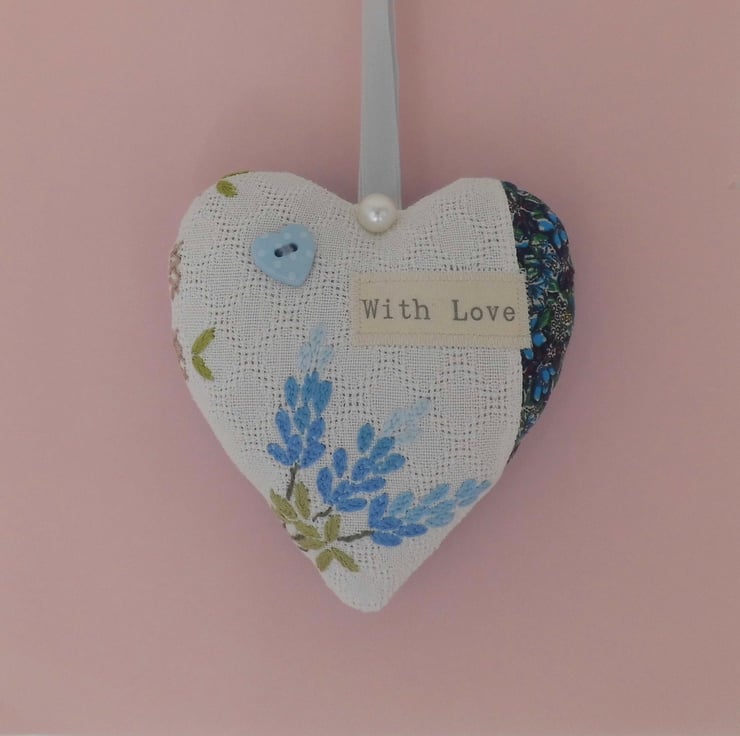A single padded heart-shaped decoration featuring pretty embroidery snipped from the remains of a vintage tablecloth and edged with blue Liberty lawn. I have added a piece of ribbon which reads 'With Love' and a blue heart shaped button. The back is plain blue cotton fabric.