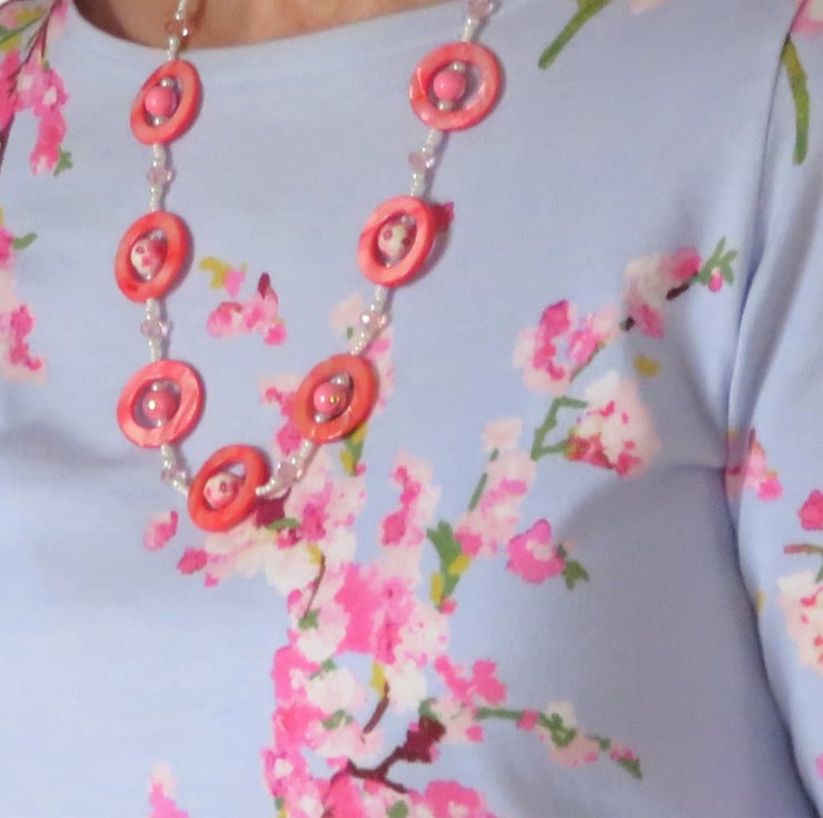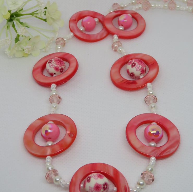 Shell rings in a gorgeous shade of coral pink go to make up the 'Rings of Saturn' in this piece. The rings encirle either a polymer clay bead in pink and white or iridescent pink glass pearls. Matched with co-ordinating miyuki seed beads, white glass pearls and coral pink glass rondelles. This necklace measures 26" and is long enough to simply slip over your head, so no fastenings are needed. The shell rings measure 3cm in diameter.
