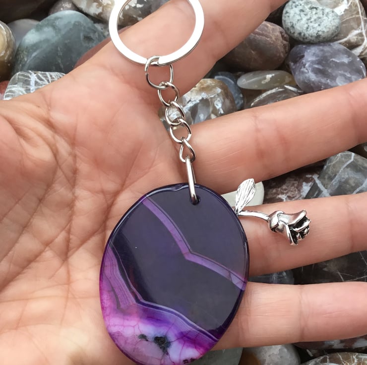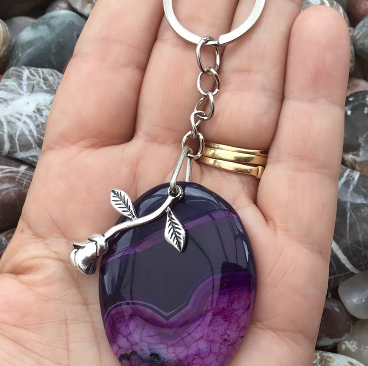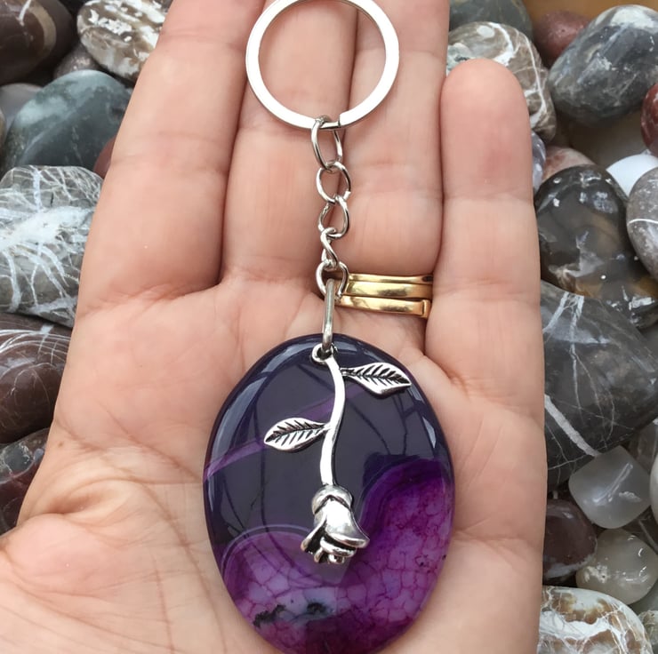 Purple Rose! A lovely and substantial oval Fancy Agate and 3D Rose Gemstone Keyring, with silver tone keychain & split ring, to make this item useable as a keyring, or handbag charm.