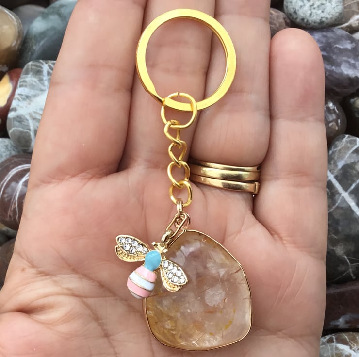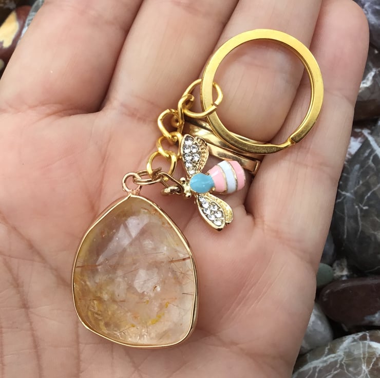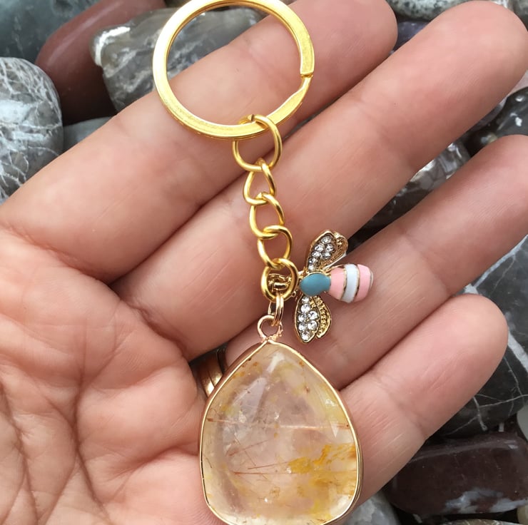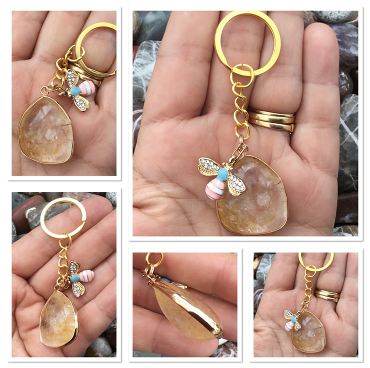 Honey Pot! A fine Golden Rutilated Quartz Gemstone, made into Keyring bezel set surround with gold tone keychain & split ring, to make this item useable as a keyring, or handbag charm. With the addition of an enamelled Bee Charm.