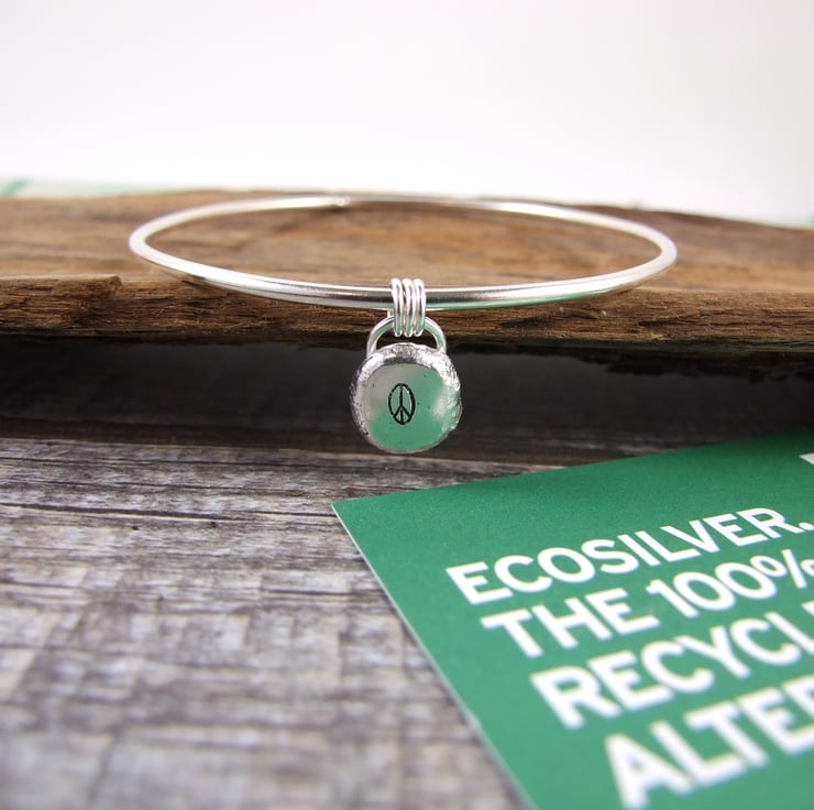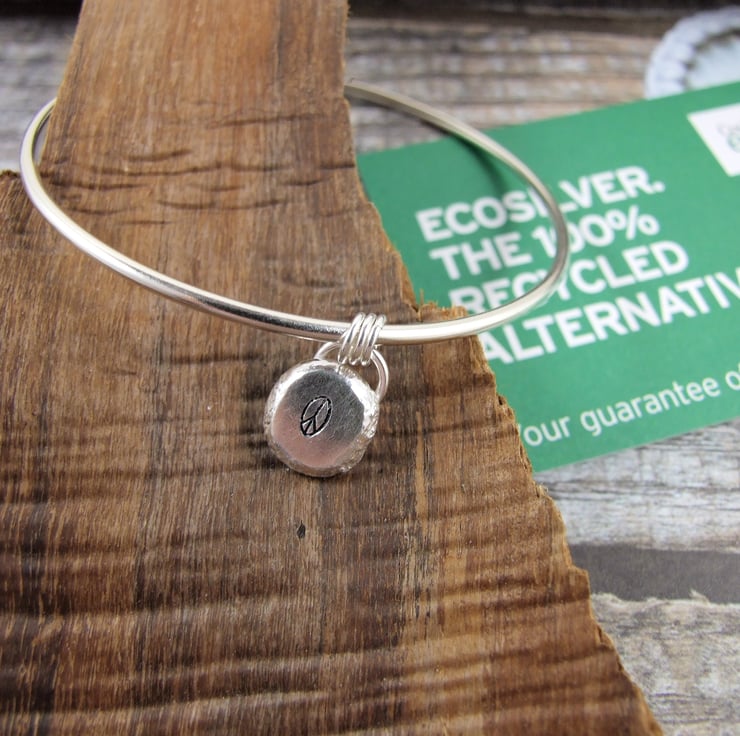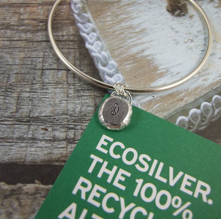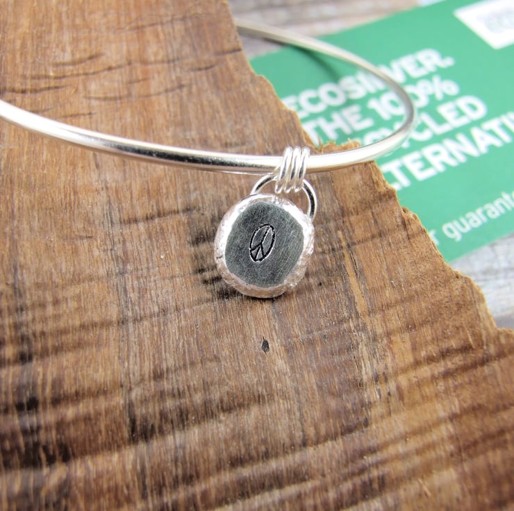I have made the bangle from 2mm Eco-Silver wire which I have soldered sanded, shaped and polished. The little charm has been created from my own recycled silver, cast into a nugget which I have hammered to create a flat surface and hand stamped with a peace symbol.