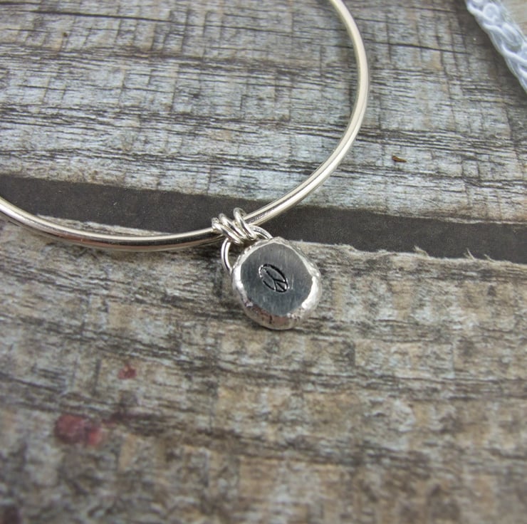 Recycled Sterling Silver Peace Charm Hand Forged Bangle.