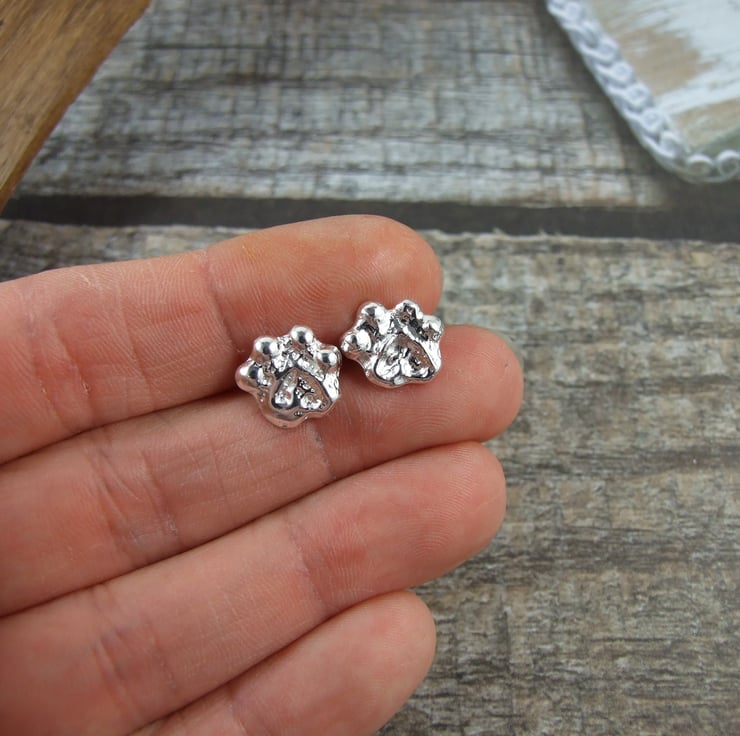 The dainty paw prints have been created from molten recycled sterling silver, cast into carbon which has been hand carved into a paw print shape. Fitted to regular .925 sterling silver ear posts with butterfly backs.