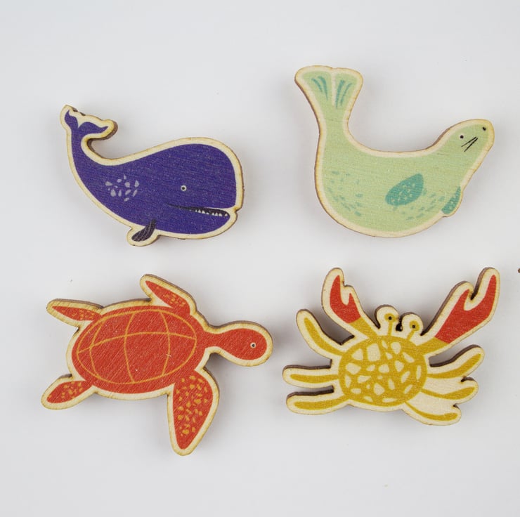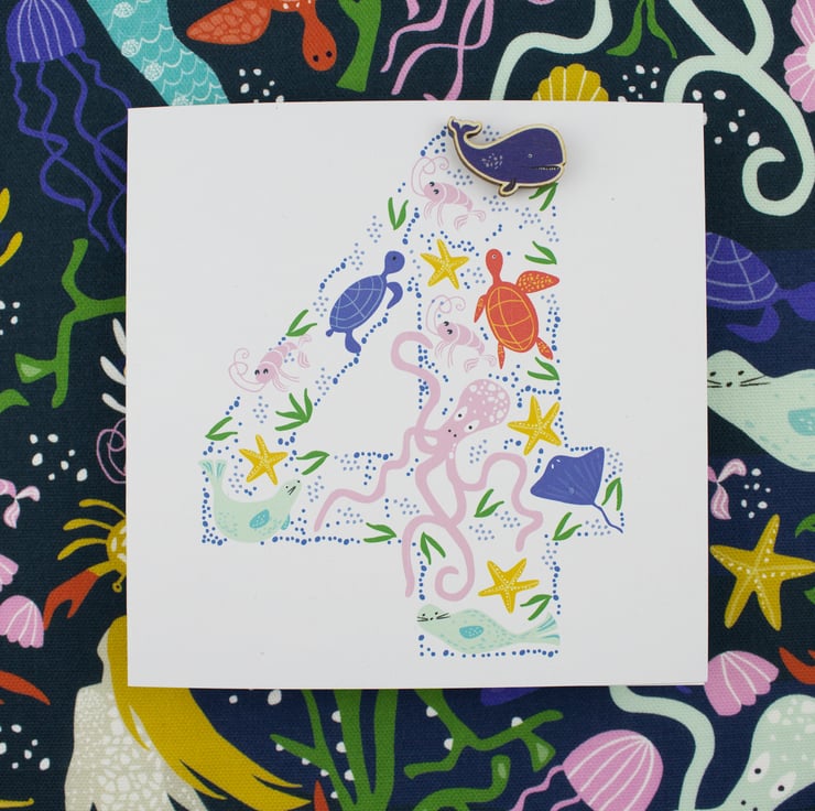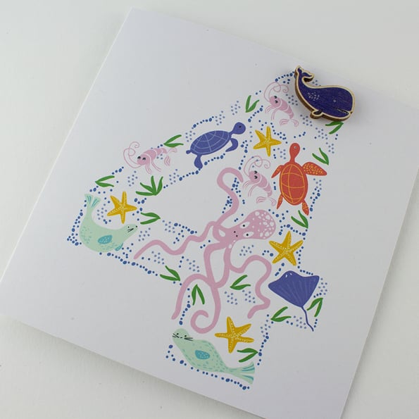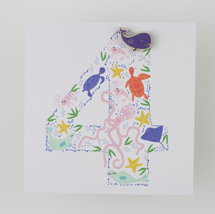We have created a range of cute cards with our ocean friends design. The design is well loved by our younger and older customers, and these cards have their own pin badge of one of the ocean friends. This card features a baby whale pin badge on age 4 design.