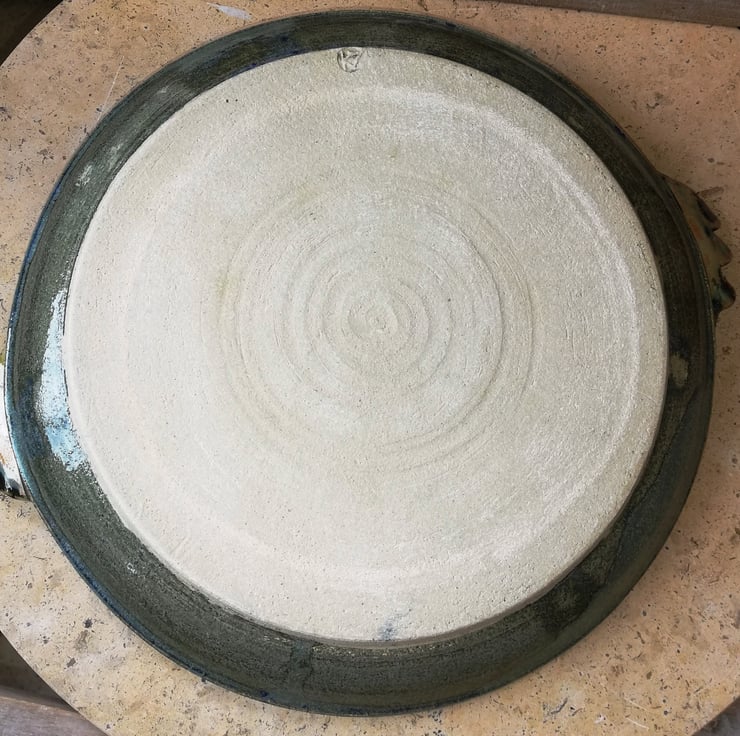 The dish is glazed in a semi glossy light blue/grey with tinges of subtle green.