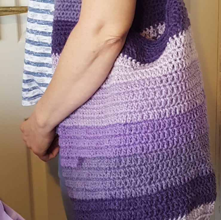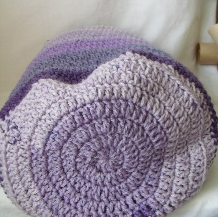 Here we have a crocheted shoulder bag in self striping purple yarn.