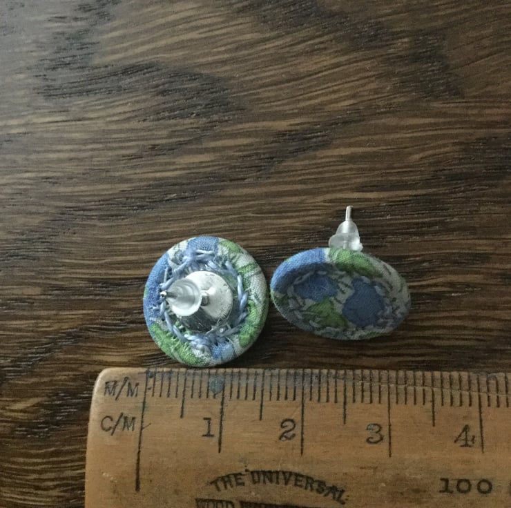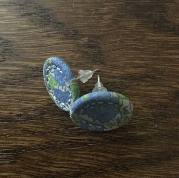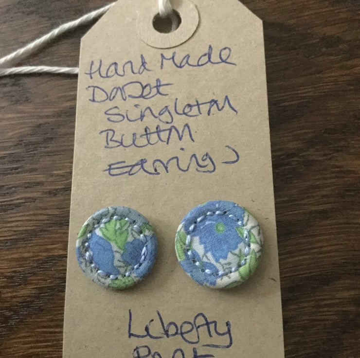 These unique, delicate Dorset button earrings are made from tiny 15 mm Singleton buttons securely fixed to a nickel-free, silver plated earring back. The fabric used is the Liberty print ‘Poppy’ in shades of blue and green hand stitched with matching pale blue thread. They are very light and easy to wear.