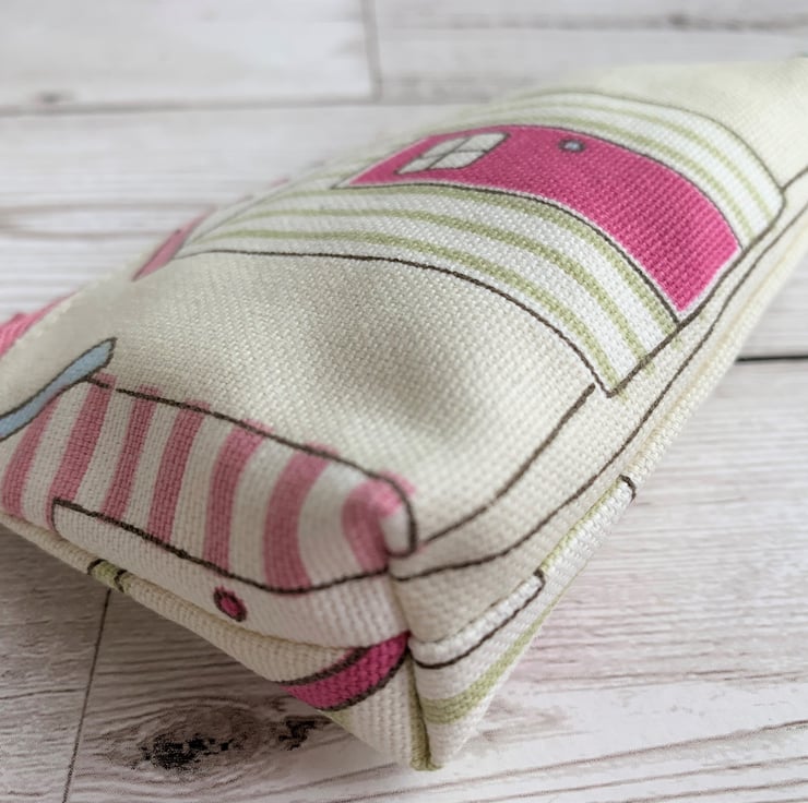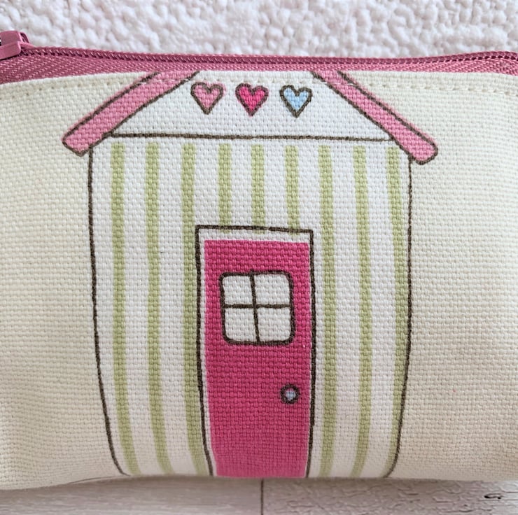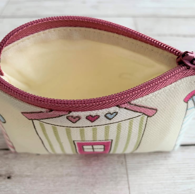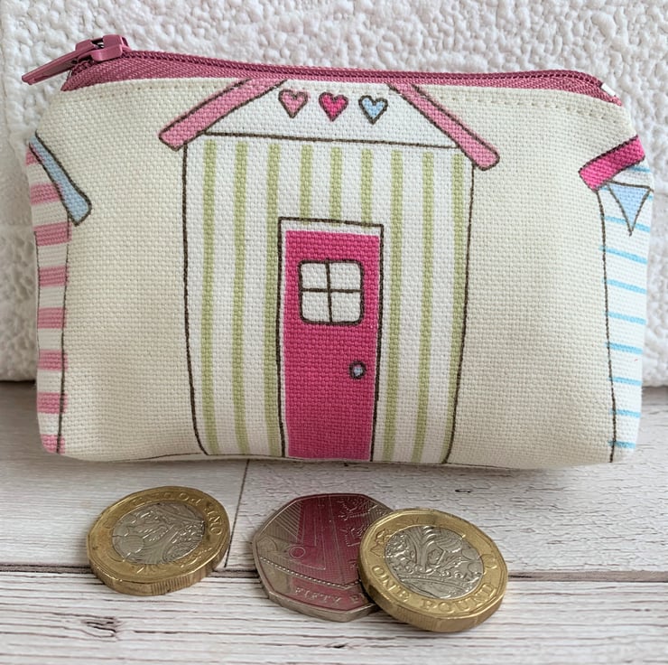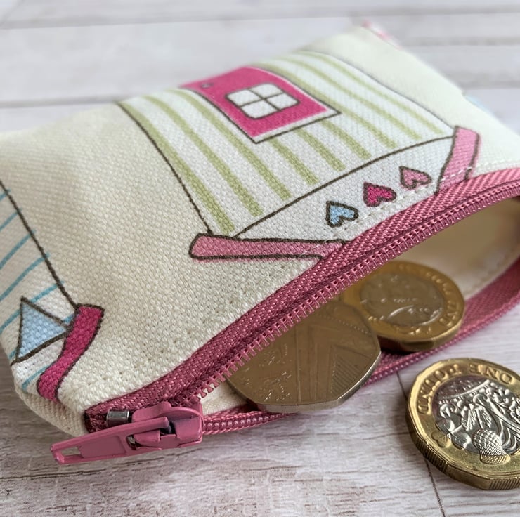 A handy small beach hut coin purse in pleasant pastel-coloured fabric. The pattern features a pale green and white striped beach hut with a pink roof and door on a cream background. The beach hut is decorated with three tiny hearts. The coin purse has a co-ordinating dusky pink zip and is lined with cream fabric. The base of the purse is boxed to give more space inside.