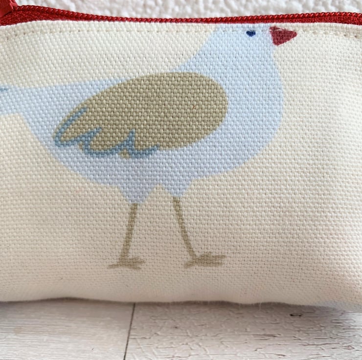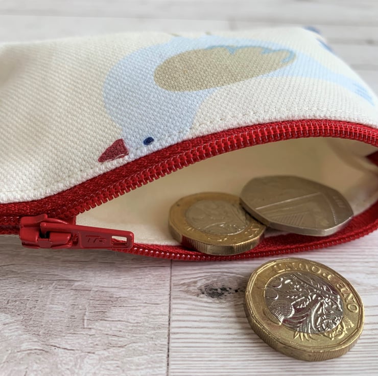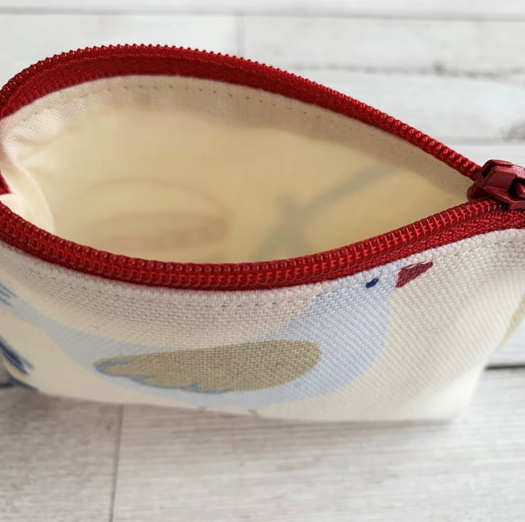 A handy small coin purse with a delightful seagull print pattern in nautical shades on a cream background. The seagull is pale blue with a beige and blue wing, beige legs and a red beak. The coin purse has a co-ordinating red zip and is lined with cream fabric. The base of the purse is boxed to give more space inside.