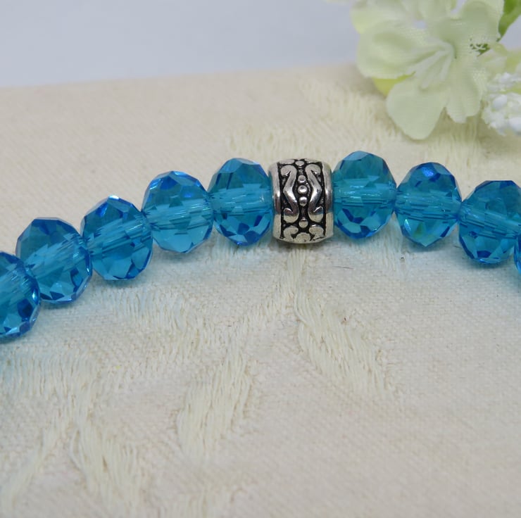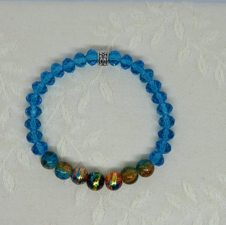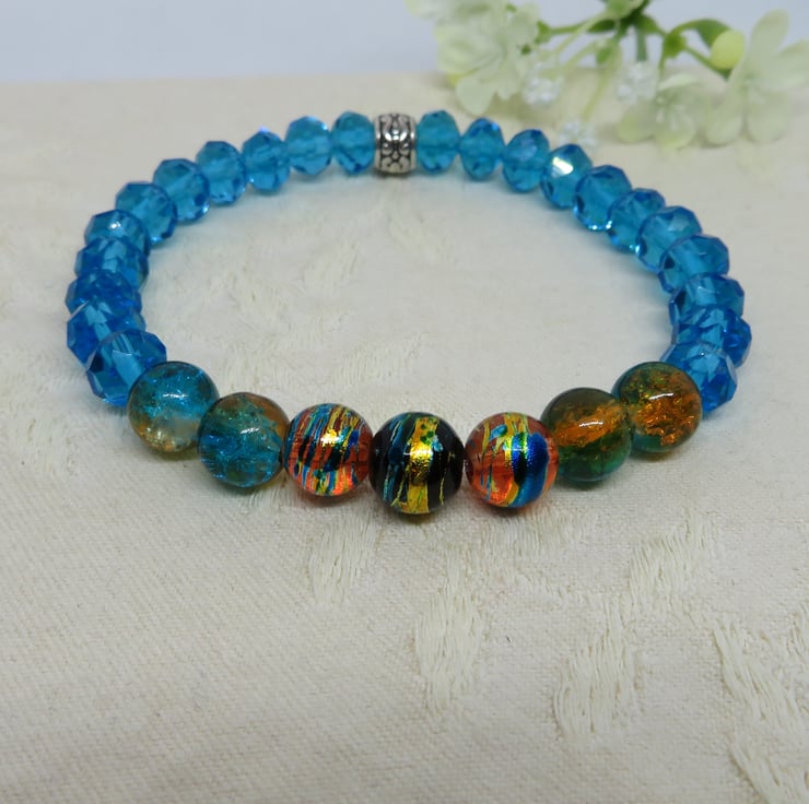 A line of drawbench glass beads and crackle glass beads in captivating shades of turquoise and gold, with turquoise glass rondelles on either side and a tibetan silver bead to finish. Comfortable to wear on strong jeweller's elastic, it has an internal circumference of 6 inches (unstretched) and will stretch to fit most wrist sizes.