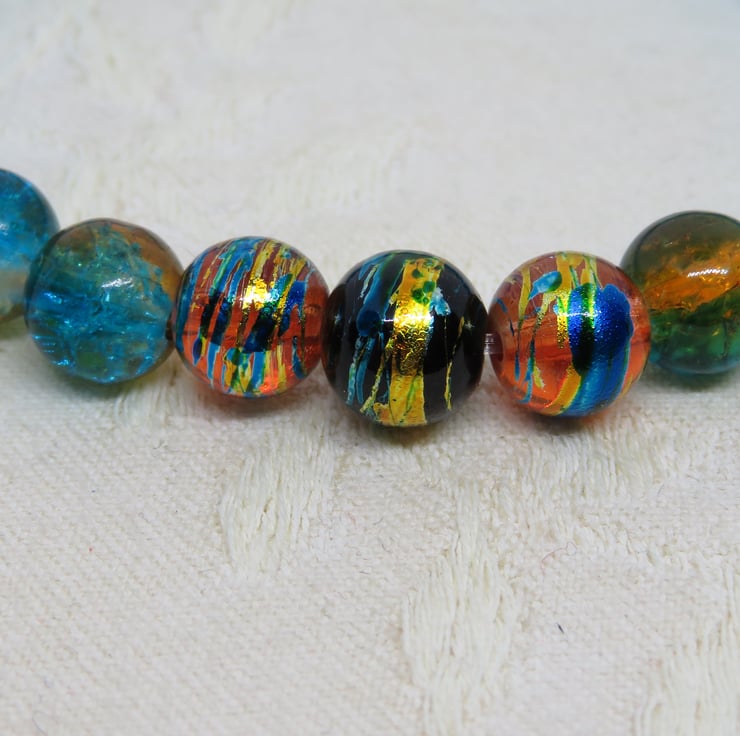 I am always on the look out for unusual beads and I love the colours of these drawbench and crackle glass beads, simply complemented by the turquoise rondelles. The drawbench beads remind me of distant planets.