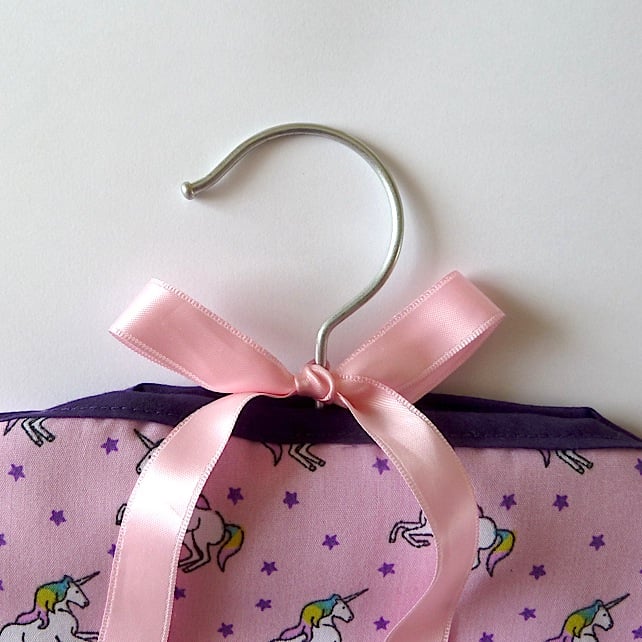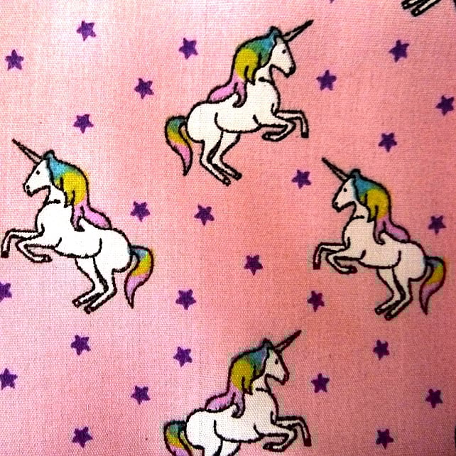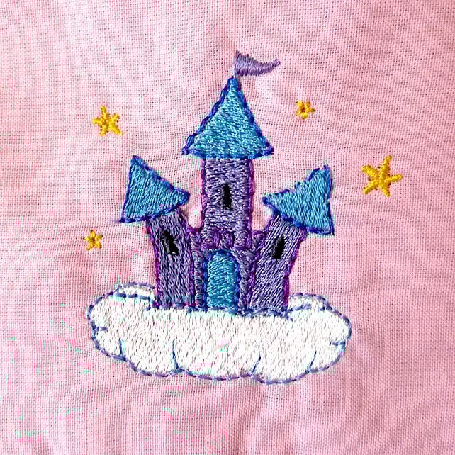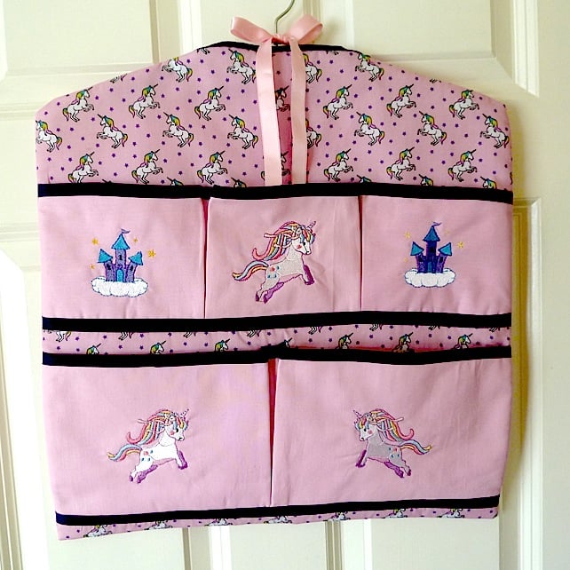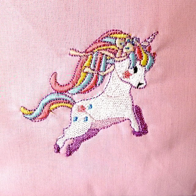 The pockets are made from pink cotton fabric with machine embroidered unicorns and fairy castles.